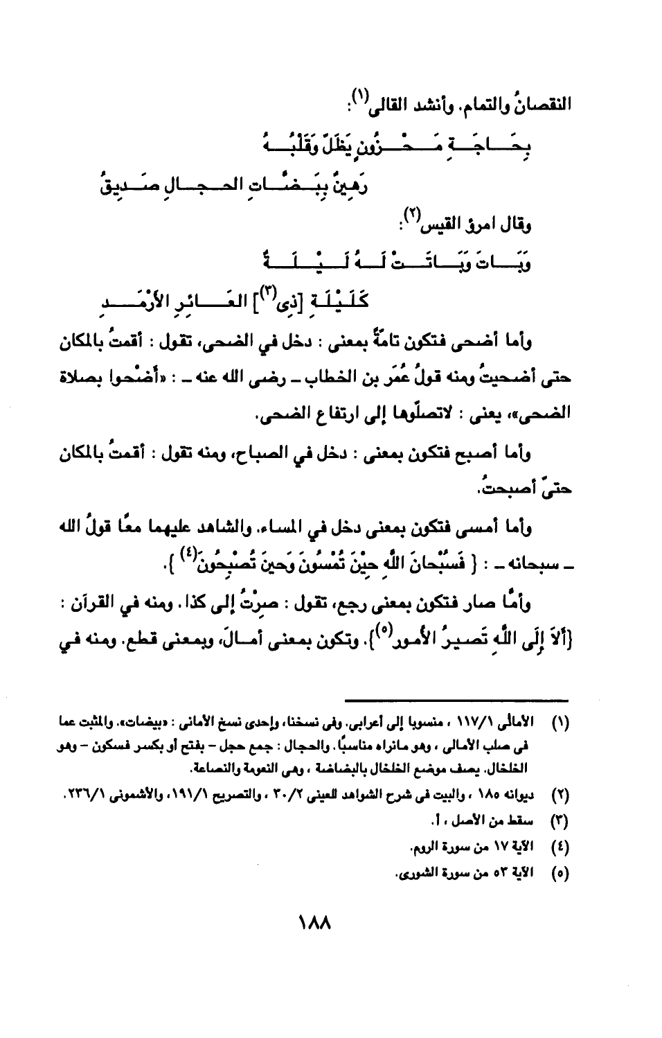وأما أضحى فتكون تامّةً بمعنى: دخل في الضحى، تقول: أقمتُ بالمكان حتى أضحيتُ ومنه قولُ عُمَر بن الخطاب -رضى الله عنه-: «أَضْحوا بصلاة الضحى»، يعنى: لا تصلّوها إلى ارتفاع الضحى.