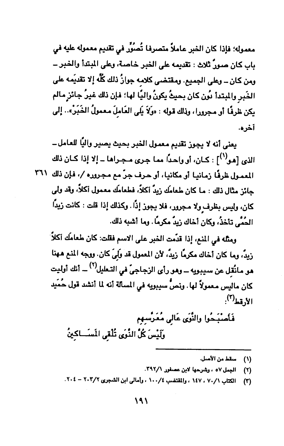 ومثله في المنع، إذا قدّمت الخبر على الاسم فقلت: كان طعامَك آكلًا زيدٌ، وما كان أخاك مكرمًا زيدٌ، لأن المعمول قد وَلِىَ كان. ووجه المنع ههنا هو ما نُقِل عن سيبويه -وهو رأى الزجاجىّ في التعليل- أنك أوليت كان ما ليس معمولًا لها. ونصُّ سيبويه في المسألة أنه لما أنشد قول حُمَيد الأرقط:
