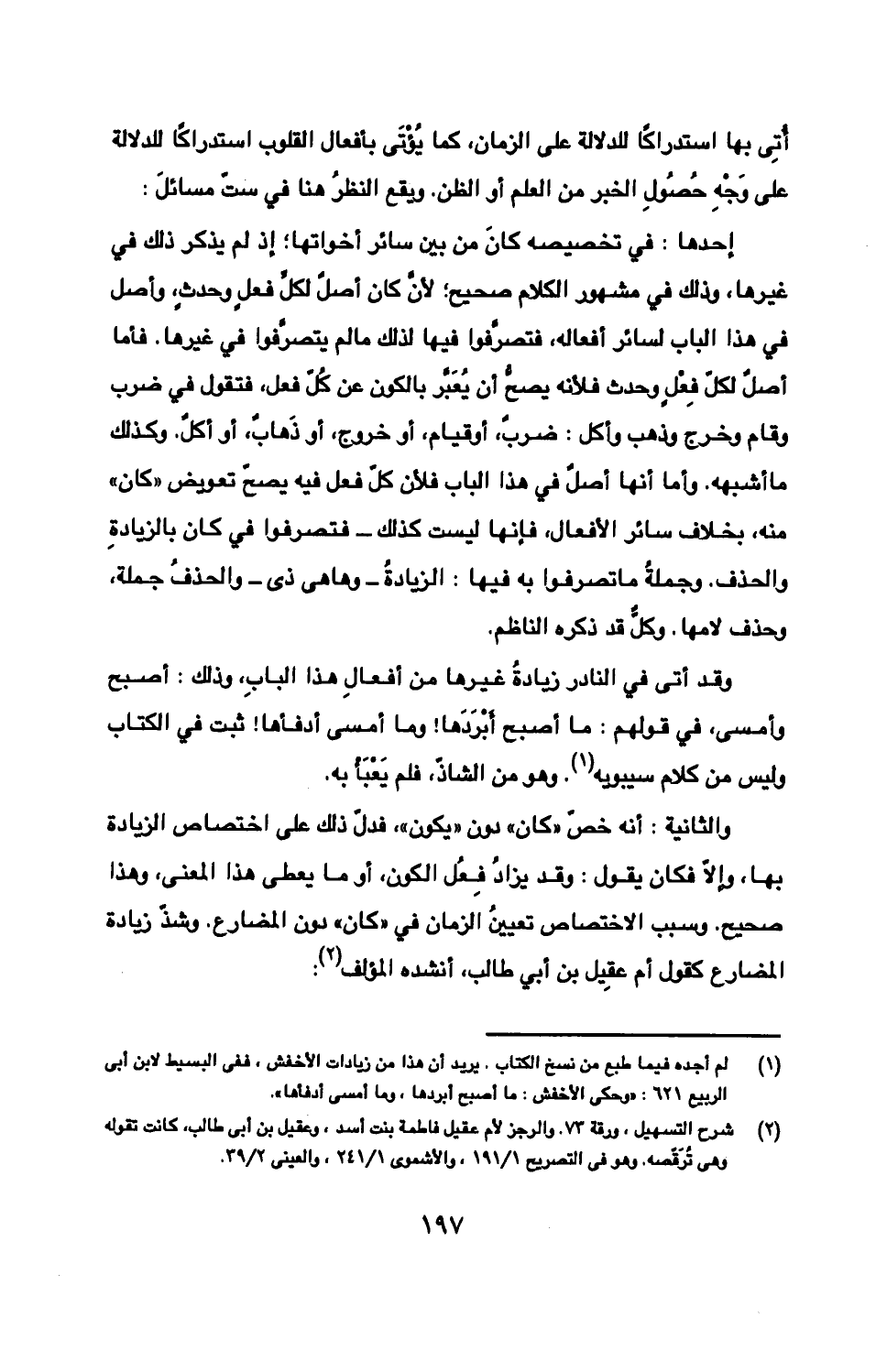 أُتِي بها استدراكًا للدلالة على الزمان، كما يُؤْتَى بأفعال القلوب استدراكًا للدلالة على وَجْهِ حُصُولِ الخبر من العلم أو الظن. ويقع النظرُ هنا في ستّ مسائلَ:
