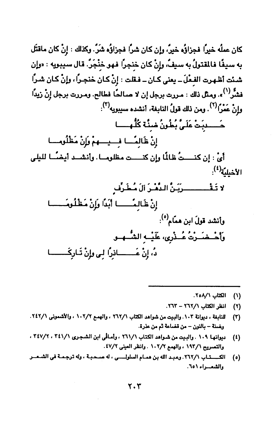 كان عملُه خيرًا فجزاؤُه خيرٌ، وإن كان شرًا فجزاؤُه شَرٌّ. وكذلك: إِنْ كان ما قتَل به سيفًا فالمقتولُ به سيفٌ، وإِنْ كان خِنجرًا فهو خِنْجَرٌ. قال سيبويه: «وإن شئت أظهرت الفَعْلَ -يعنى كان- فقلت: إِنْ كان خنجرًا، وإِنْ كان شرًا فشرُّ». ومثل ذلك: مررت برجل إن لا صالحًا فطالح. ومررت برجل إِنْ زيدًا وإِنْ عَمْرًا. ومن ذلك قولُ النابغة، أنشده سيبويه: