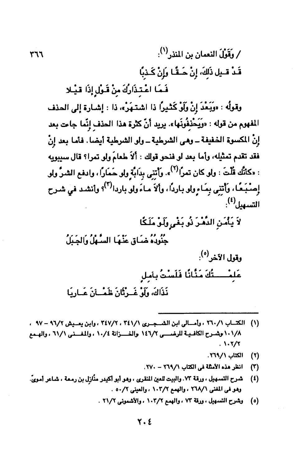 وقولُه: «وَبَعْدَ إِنْ وَلَوْ كثيرًا ذا اشتهَرْ»، ذا: إشارة إلى الحذف المفهوم من قوله: «وَيَحْذِفُونَها». يريد أنّ كثرة هذا الحذفِ إِنّما جاءت بعد إِنْ المكسوة الخفيفة -وهى الشرطية- ولو الشرطية أيضا. فأما بعد إِنْ فقد تقدم تمثيله، وأما بعد لو فنحو قولك: ألَا طعامَ ولو تمرا؟ قال سيبويه: «كأنّك قُلْتَ: ولو كان تمرًا». وَأْتِنِى بِدَابّةٍ ولو حَمَارًا، وادفع الشرّ ولو إِصْبَعًا، وَأْتِنِى بِمَاءٍ ولو باردًا، وأَلَا ماءَ ولو باردا؟ وأنشد في شرح التسهيل: