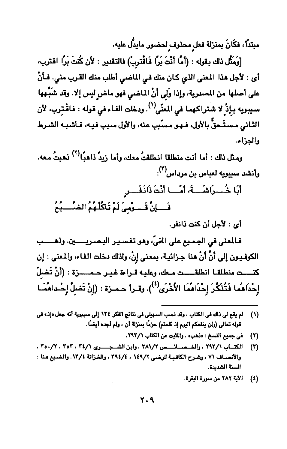 [وَمَثّل ذلك بقوله: (أَمّا أَنْتَ بَرّا فَاقْترِبْ) فالتقدير: لأَن كُنتَ بَرّا اقترب، أى: لأجل هذا المعنى الذي كان منك في الماضي أطلب منك القرب مني. فأَنْ على أصلها من المصدرية، وإذا وَلِى أَنْ الماضي فهو ماضٍ ليس إلا. وقد شَبّهها سيبويه بِإذ لاشتراكهما في المعنى. ودخلت الفاء في قوله: فاقْترِب، لأن الثاني مستَحقٌّ بالأول، فهو مسبب عنه، والأول سبب فيه، فأشبه الشرط والجزاء.