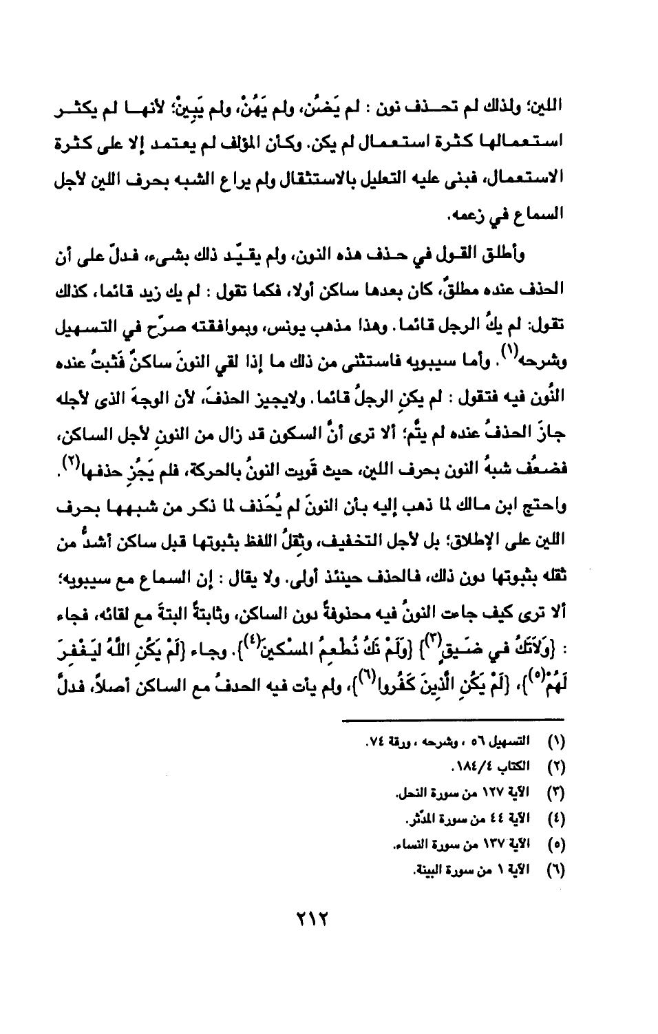 وأطلق القول في حذف هذه النون، ولم يقيّد ذلك بشئ، فدلّ على أن الحذف عنده مطلقٌ، كان بعدها ساكن أولا، فكما تقول: لم يك زيد قائما، كذلك تقول: لم يكُ الرجل قائما. وهذا مذهب يونس، وبموافقته صرّح في التسهيل وشرحه. وأما سيبويه فاستثنى من ذلك ما إذا لقي النونَ ساكنٌ فَثبتُ عنده النُون فيه فتقول: لم يكنِ الرجلُ قائما. ولا يجيز الحذفَ، لأن الوجهَ الذى لأجله جازَ الحذفُ عنده لم يتم؛ إلا ترى أنّ السكون قد زال من النونِ لأجل الساكن، فضعُف شبهُ النون بحرف اللين، حيث قَويت النونُ بالحركة، فلم يَجُزِ حذفها. واحتج ابن مالك لما ذهب إليه بأن النونَ لم ُيحذف لما ذكر من شبهها بحرف اللين على الإطلاق؛ بل لأجل التخفيف، وثِقلُ اللفظ بثبوتها قبل ساكن أشدُّ من ثقله بثبوتها دون ذلك، فالحذف حينئذ أولى. ولا يقال: إن السماع مع سيبويه؛ ألا ترى كيف جاءت النونُ فيه محذوفةً دون الساكن، وثابتةً البتةَ مع لقائه، فجاء: {وَلَاتَكُ في ضَيقٍ} {وَلَمْ نَكُ نُطْعِمُ المسْكينَ}. وجاء {لَمْ يَكُنِ اللهُ ليَغْفِرَ لَهُمْ}، {لَمْ يَكُنِ الّذِينَ كَفُروا}، ولم يأت فيه الحدفُ مع الساكن أصلًا، فدلّ