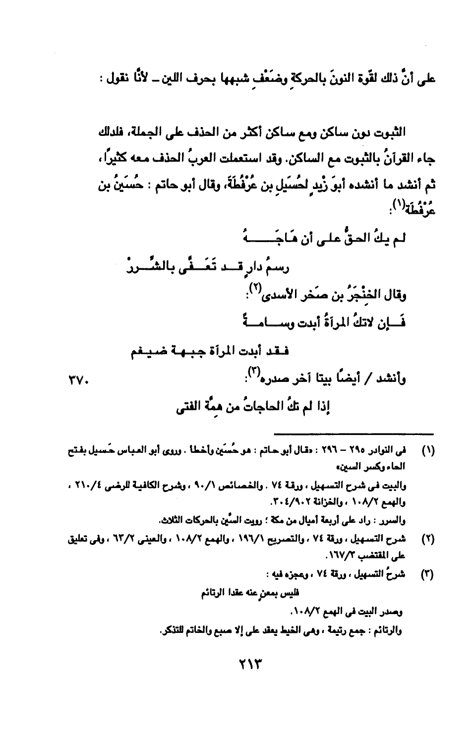 الثبوت دون ساكن ومع ساكن أكثر من الحذف على الجملة، فلدلك جاء القرآنُ بالثبوت مع الساكن. وقد استعملت العربُ الحذف معه كثيرًا، ثم أنشد ما أنشده أبوَ زْيدٍ لحُسَيلِ بن عُرْفُطَةَ، وقال أبو حاتم: حُسَينُ بن عُرْفُطَة: