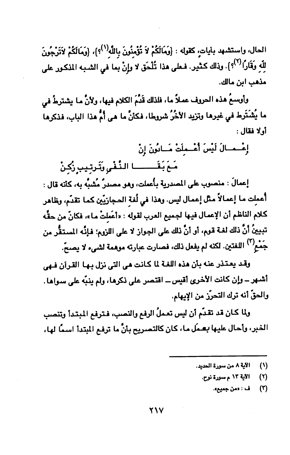 الحال، واستشهد بآياتٍ، كقوله: {وَمَا لَكُمْ لَا تُؤْمِنُونَ بِاللهِ؟ }، {وَمَا لَكُمْ لَا تَرْجُونَ للهِ وَقَارًا؟ }. وذلك كثير. فعلى هذا تُلْحَق لا وإِنْ بما في الشبه المذكور على مذهب ابن مالك.