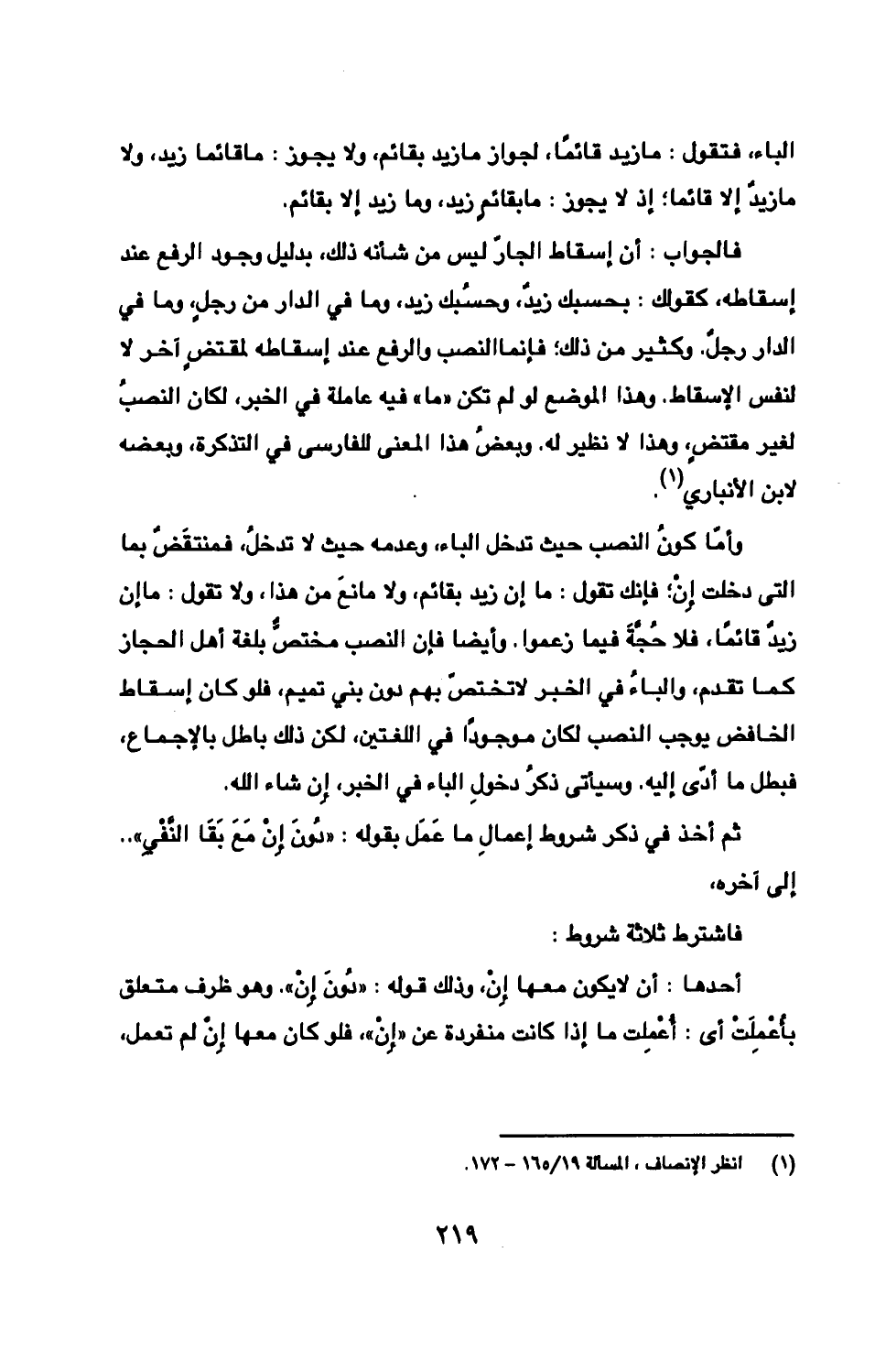 وأمّا كونُ النصب حيث تدخل الباء، وعدمه حيث لا تدخلُ، فمنتقَضٌ بما التى دخلت إِنْ؛ فإنك تقول: ما إن زيد بقائم، ولا مانعَ من هذا، ولا تقول: ما إن زيدٌ قائمًا، فلا حُجُةً فيما زعموا. وأيضا فإن النصب مختصٌّ بلغة أهل الحجاز كما تقدم، والباءُ في الخبر لا تختصّ بهم دون بني تميم، فلو كان إسقاط الخافض يوجب النصب لكان موجودًا في اللغتين، لكن ذلك باطل بالإجماع، فبطل ما أدّى إليه. وسيأتى ذكرُ دخولِ الباء في الخبر، إِن شاء الله.