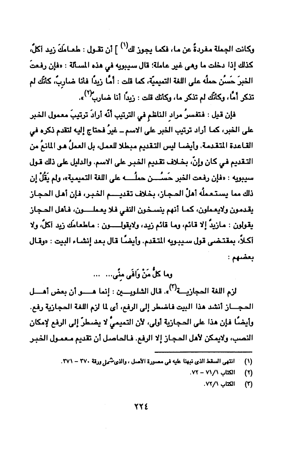 فإن قيل: فتفسرُ مرادِ الناظمِ في الترتيب أَنّه أرادَ ترتيبَ معمول الخبر على الخبر، كما أراد ترتيب الخبر على الاسم -غيرُ فحتاج إليه لتقدم ذكره في القاعدة المتقدمة. وأيضا ليس التقديم مبطلا للعمل، بل العملُ هو المانعُ من التقديم في كان وإنّ، بخلاف تقديم الخبر على الاسم. والدليل على ذلك قول سيبويه: «فإن رفعت الخبر حَسُن حملُه على اللغة التميمية»، ولم يَقُلْ إن ذلك مما يستعملُه أهلْ الحجاز، بخلاف تقديم الخبر، فإن أهل الحجاز يقدمون ولا يعملون، كما أنهم ينسخون النفي فلا يعملون، فأهل الحجاز يقولون: ما زيدٌ إلا قائم، وما قائم زيد، ولا يقولون: ما طعامَك زيد آكلٌ، ولا آكلًا، بمقتضى قول سيبويه المتقدم. وأيضًا قال بعد إنشاء البيت: «وقال بعضهم: