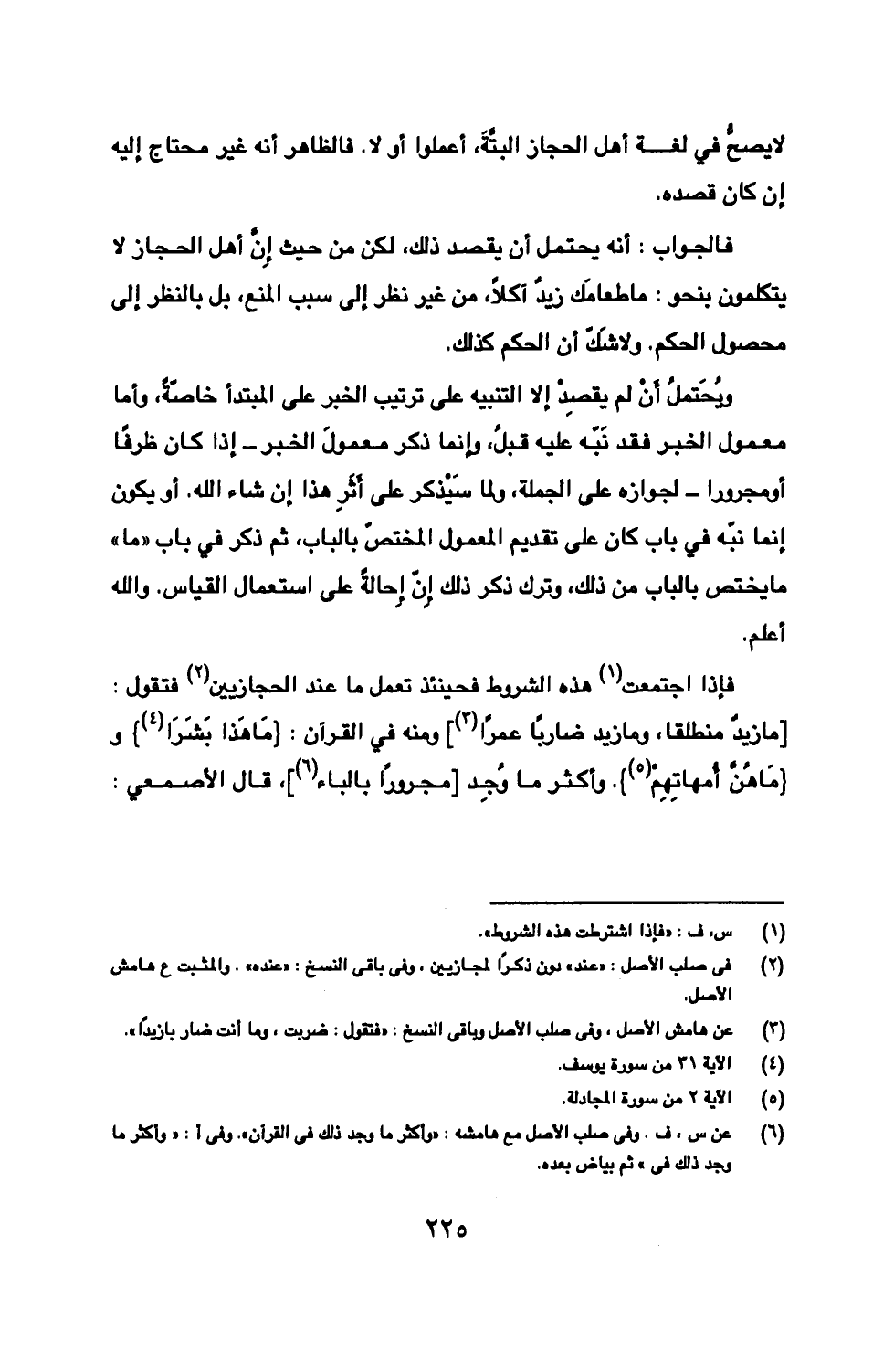 فإذا اجتمعت هذه الشروط فحينئذ تعمل ما عند الحجازيين فتقول: [ما زيدٌ منطلقا، وما زيد ضاربًا عمرًا] ومنه في القرآن: {مَا هَذا بَشَرَا} و {مَا هُنّ أُمهاتِهِمْ}. وأكثر ما وُجِد [مجرورًا بالباء]، قال الأصمعي:
