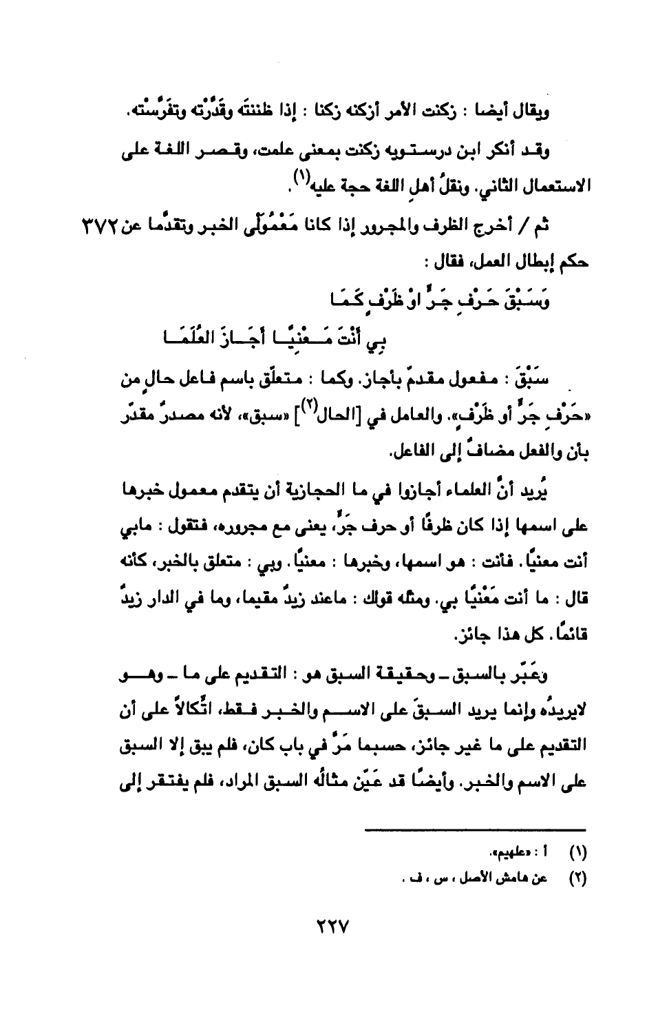 وعَبّر بالسبق -وحقيقة السبق هو: التقديم على ما- وهو لا يريدُه وإنما يريد السبقَ على الاسم والخبر فقط، اتّكالًا على أن التقديم على ما غير جائز، حسبما مَرّ في باب كان، فلم يبق إلا السبق على الاسم والخبر. وأيضًا قد عَيّن مثالُه السبق المراد، فلم يفتقر إلى