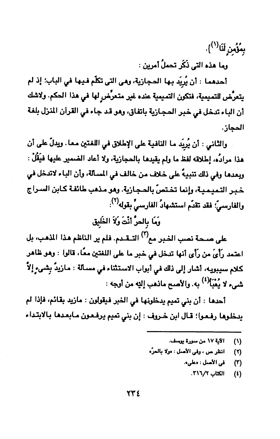 أحدهما: أن يُرِيدَ بها الحجازية، وهى التى تكلّم فيها في الباب؛ إذ لم يتعرّض للتميمية، فتكون التميمية عنده غير متعرِّضٍ لها في هذا الحكم. ولا شك أن الباء تدخل في خبر الحجازية باتفاق، وهو قد جاء في القرآن المنزل بلغة الحجاز.