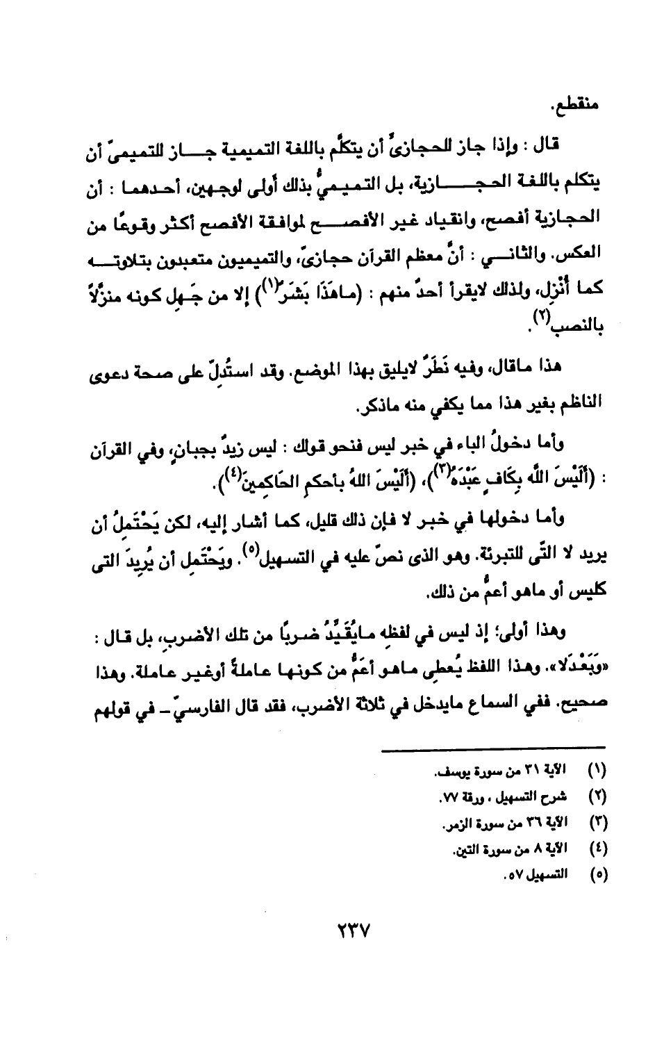قال: وإذا جاز للحجازىِّ أن يتكلّم باللغة التميمية جاز للتميمىّ أن يتكلم باللغة الحجازية، بل التميميُّ بذلك أولى لوجهين، أحدهما: أن الحجازية أفصح، وانقياد غير الأفصح لموافقة الأفصح أكثر وقوعًا من العكس. والثاني: أنّ معظم القرآن حجازىّ، والتميميون متعبدون بتلاوته كما أُنْزِل، ولذلك لا يقرأ أحدٌ منهم: {ما هَذَا بَشَرٌ} إلا من جَهِل كونه منزّلًا بالنصب.