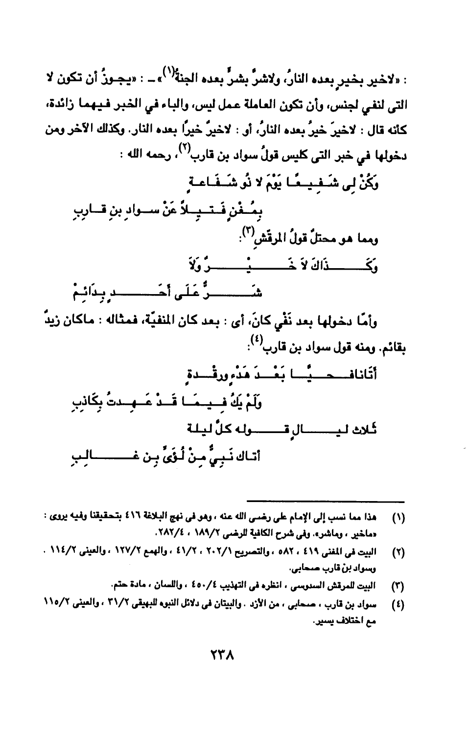 : «لا خير بخيرٍ بعده النارُ، ولا شرّ بشرٍّ بعده الجنةُ» -: «يجوزُ أن تكون لا التى لنفي لجنس، وأن تكون العاملة عمل ليس، والباء في الخبر فيهما زائدة، كأنه قال: لا خيرَ خيرُ بعده النارُ، أو: لا خيرٌ خيرًا بعده النار. وكذلك الآخر ومن دخولها في خبر التى كليس قولُ سواد بن قارب، رحمه الله: