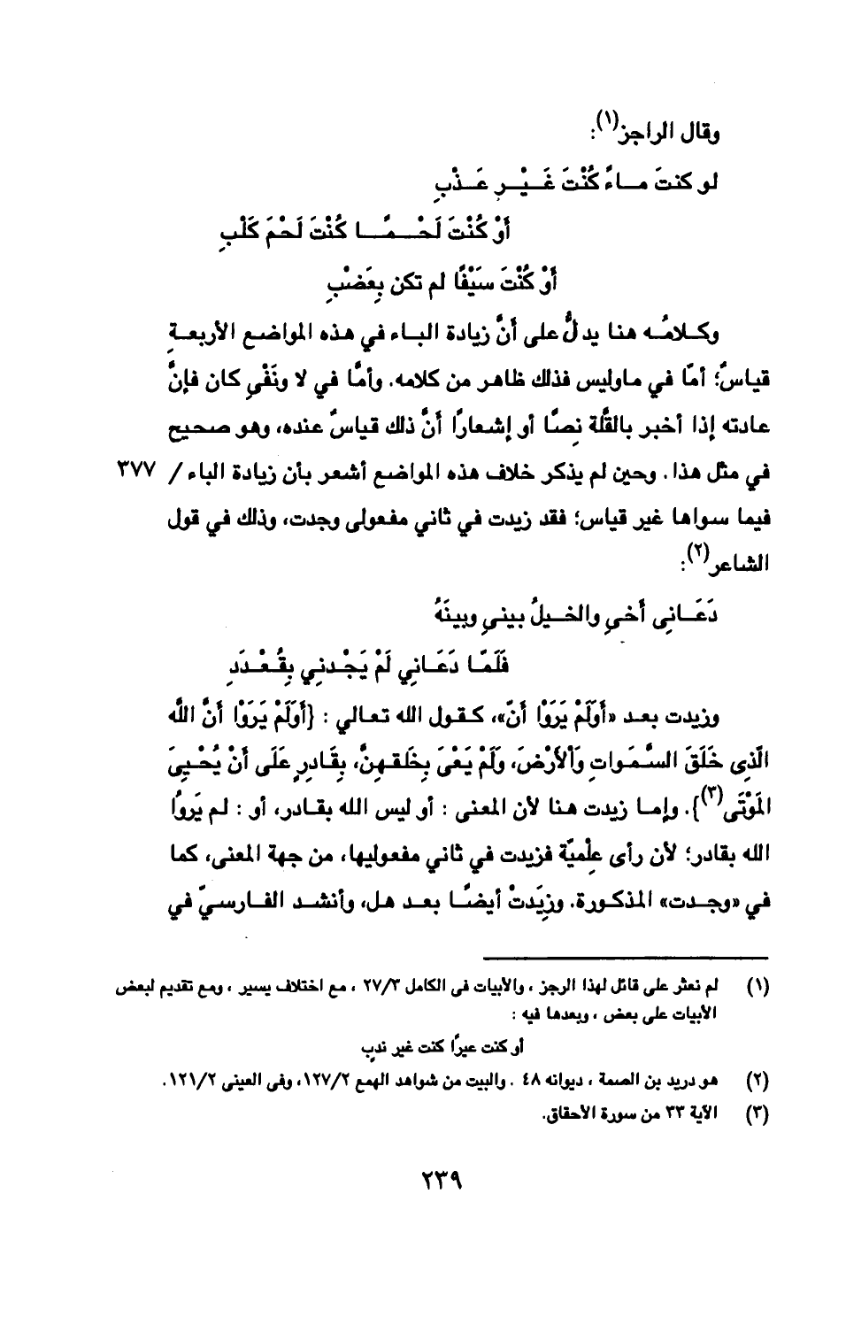 وكلامُه هنا يدلُّ على أَنّ زيادة الباء في هذه المواضع الأربعةِ قياسٌ؛ أمّا في ما وليس فذلك ظاهر من كلامه. وأمّا في لا ونَفْىِ كان فإنّ عادته إذا أخبر بالقلّة نِصًا أو إشعارًا أَنّ ذلك قياسٌ عنده، وهو صحيح في مثل هذا. وحين لم يذكر خلاف هذه المواضع أشعر بأن زيادة الباء/ فيما سواها غير قياس؛ فقد زيدت في ثاني مفعولى وجدت، وذلك في قول الشاعر: