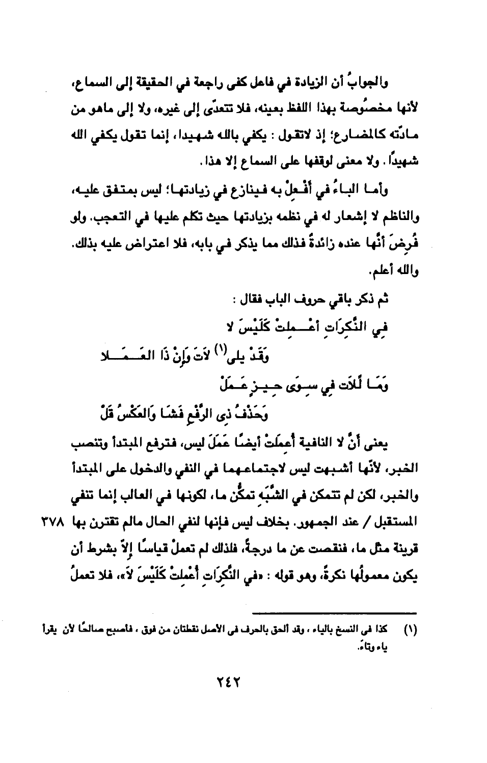 والجوابُ أن الزيادة في فاعل كفى راجعة في الحقيقة إلى السماع، لأنها مخصُوصة بهذا الفظ بعينه، فلا تتعدّى إلى غيره، ولا إلى ما هو من مادّته كالمضارع؛ إذ لا تقول: يكفي بالله شهيدا، إنما تقول يكفي الله شهيدًا. ولا معنى لوقفها على السماع إلا هذا.