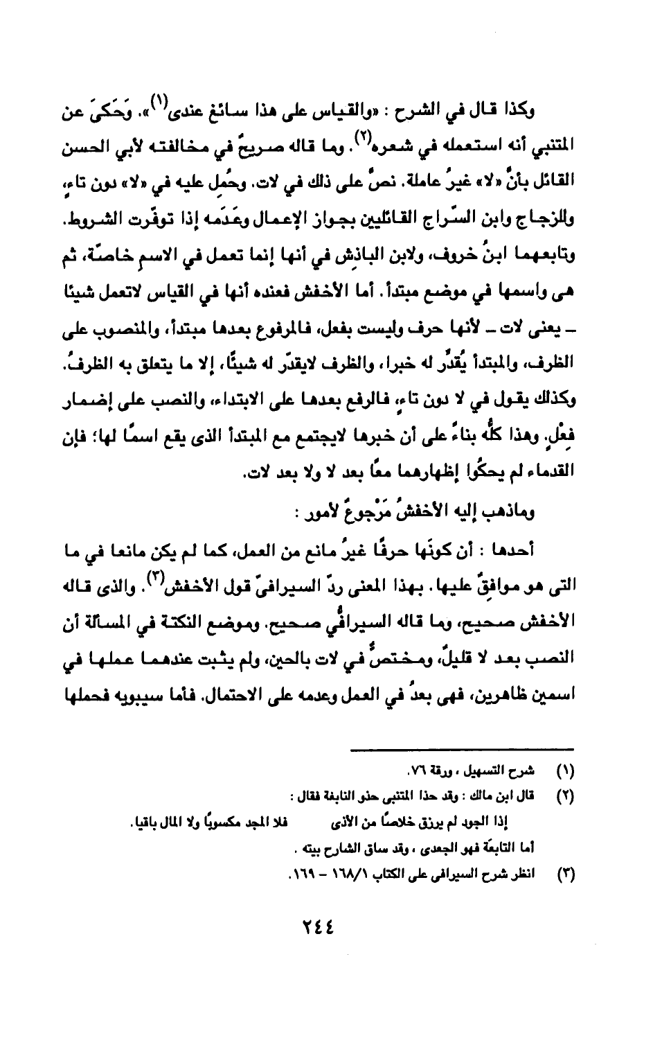 أحدها: أن كونَها حرفًا غيرُ ما نع من العمل، كما لم يكن مانعا في ما التى هو موافِقٌ عليها. بهذا المعنى ردّ السيرافيّ قول الأخفش. والذى قاله الأخفش صحيح، وما قاله السيرافي صحيح. وموضع النكتة في المسالة أن النصب بعد لا قليلٌ، ومختصٌّ في لات بالحين، ولم يثبت عندهما عملها في اسمين ظاهرين، فهى بعدُ في العمل وعدمه على الاحتمال. فأما سيبويه فحملها