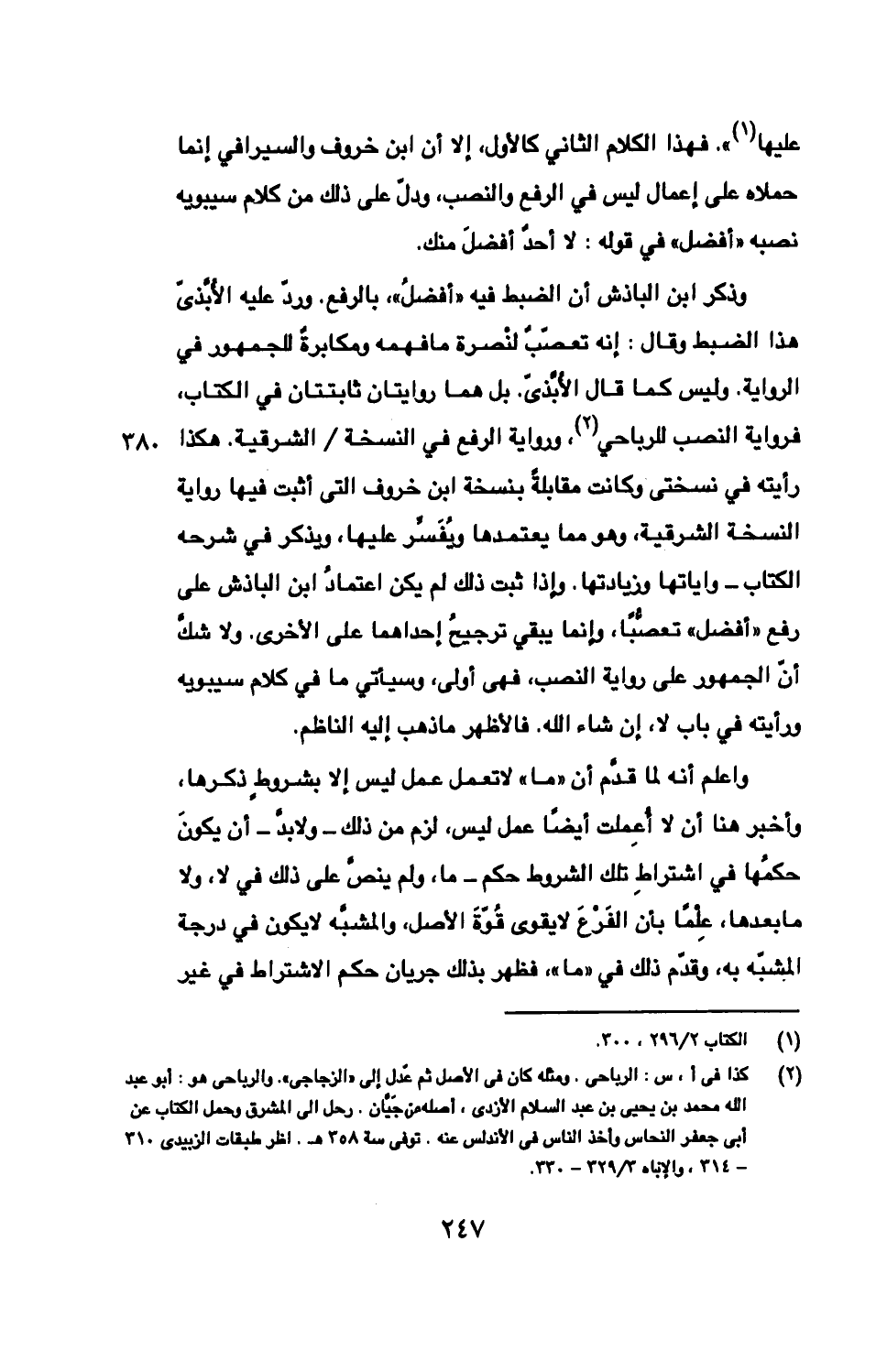 عليها». فهذا الكلام الثاني كالأول، إلا أن ابن خروف والسيرافي إنما حملاه على إعمال ليس في الرفع والنصب، ودلّ على ذلك من كلام سيبويه نصبه «أفضل» في قوله: لا أحدٌ أفضلَ منك.