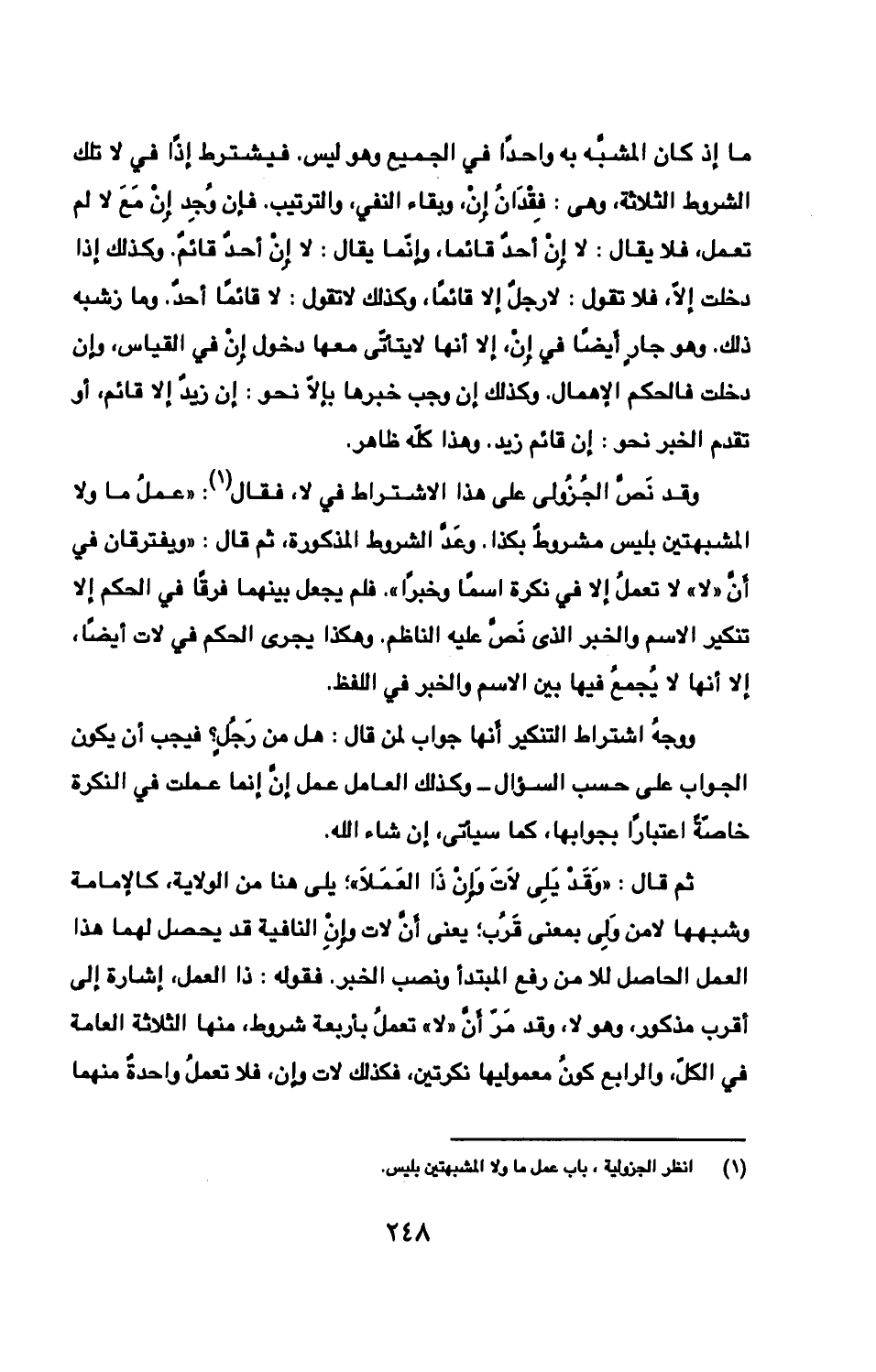 وقد نَصّ الجُزُولى على هذا الاشتراط في لا، فقال: «عملُ ما ولا المشبهتين بليس مشروطٌ بكذا. وعَدّ الشروط المذكورة، ثم قال: «ويفترقان في أَنّ «لا» لا تعملُ إلا في نكرة اسمًا وخبرًا». فلم يجعل بينهما فرقًا في الحكم إلا تنكير الاسم والخبر الذى نَصّ عليه الناظم. وهكذا يجرى الحكم في لات أيضًا، إلا أنها لا يُجمعُ فيها بين الاسم والخبر في اللفظ.