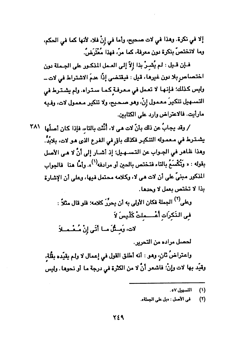 / وقد يجابُ عن ذلك بأنّ لات هى لا، أُنِّثت بالتاءِ، فإذا كان أصلُها يشترط في معموله التنكير فكذلك باقٍ في الفرع الذى هو لات، بلابُدٍّ. وهذا ظاهر في الجواب عن التسهيل؛ إذ أشار إلى أنّ لا هى الأصل بقوله: «وَتُكْسَعُ بالتاءِ فتختص بالحين أو مرادفه». وأمّا هنا فالجواب المذكور مبنىّ على أن لات هى لا، وكلامه محتمل فيها، وعلى أن الإشارة بذا لا تختص بعمل لا وحدها.