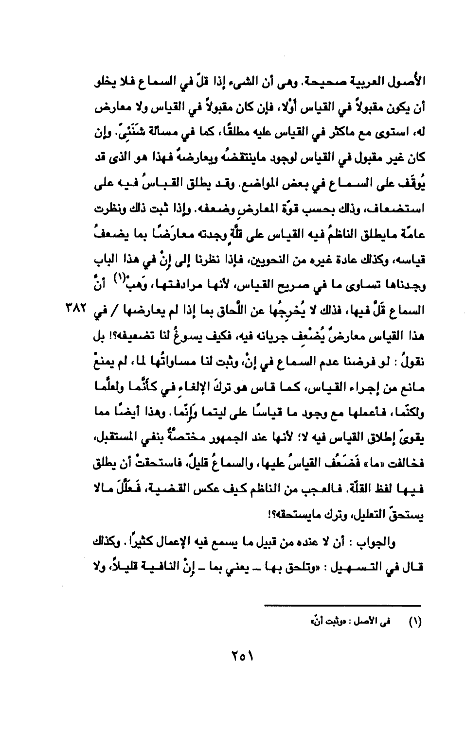 الأصول العربية صحيحة. وهى أن الشئ إذا قلّ في السماع فلا يخلو أن يكون مقبولًا في القياس أَوْلا، فإن كان مقبولًا في القياس ولا معارض له، استوى مع ما كثر في القياس عليه مطلقًا، كما في مسألة شَنَئِىّ. وإن كان غير مقبول في القياس لوجود ما ينتقضُه ويعارضه فهذا هو الذى قد يُوقَف على السماع في بعض المواضع. وقد يطلق القباسُ فيه على استضعاف، وذلك بحسب قوّة المعارضِ وضعفه. وإذا ثبت ذلك ونظرت عامّة ما يطلق الناظمُ فيه القياس على قلّةٍ وجدته معارَضًا بما يضعفُ قياسه، وكذلك عادة غيره من النحويين، فإذا نظرنا إلى إِنْ في هذا الباب وجدناها تساوى ما في صريح القياس، لأنها مرادفتها، وَهبْ أنّ السماع قَلّ فيها، فذلك لا يُخرِجُها عن اللَحاق بما إذا لم يعارضها/ في هذا القياس معارضٌ يُضْعِف جرينه فيه، فكيف يسوغُ لنا تضعيفه؟ ! بل نقولُ: لو فرضنا عدم السماع في إنْ، وثبت لنا مساواتُها لما، لم يمنعْ مانع من إجراء القياس، كما قاس هو تركَ الإلغاءِ في كأَنّما ولعلّما ولكنّما، فأعملها مع وجود ما قياسًا على ليتما وَإِنّما. وهذا أيضًا مما يقوىّ إطلاق القياس فيه لا؛ لأنها عند الجمهور مختصّةً بنفي المستقبل، فخالفت «ما» فَضَعُف القياسُ عليها، والسماعُ قليلٌ، فاستحقتْ أن يطلق فيها لفظ القلّة. فالعجب من الناظم كيف عكس القضية، فَعَلّلَ ما لا يستحقّ التعليل، وترك ما يستحقه؟ !