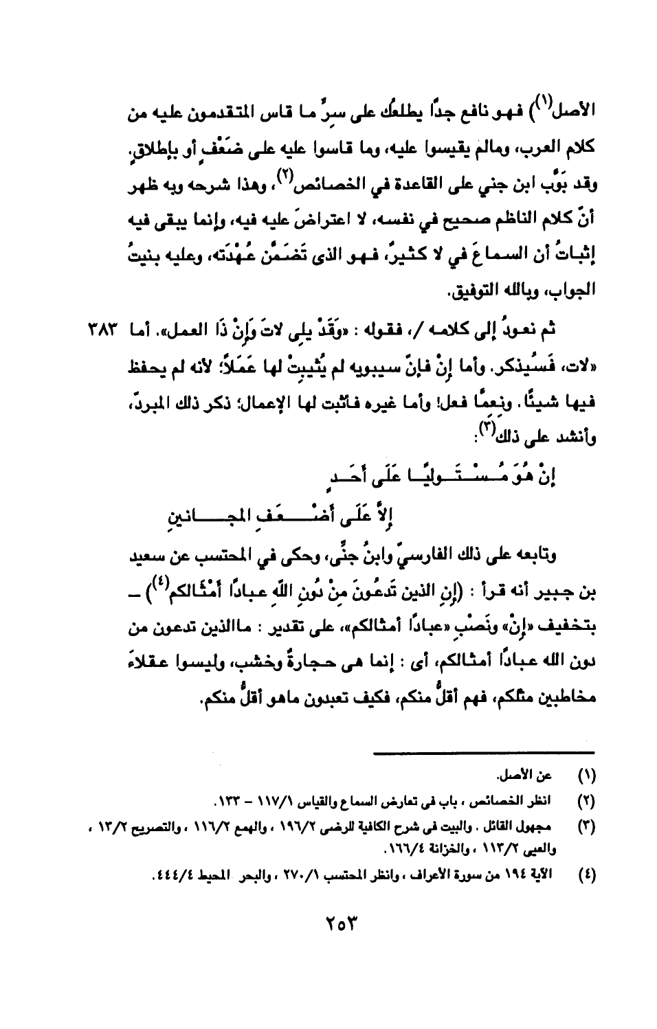 الأصل) فهو نافع جدًا يطلعُك على سِرّ ما قاس المتقدمون عليه من كلام العرب، وما لم يقيسوا عليه، وما قاسوا عليه على ضَعْفٍ أو بإطلاقٍ. وقد بَوّب ابن جني على القاعدة في الخصائص، وهذا شرحه وبه ظهر أنّ كلام الناظم صحيح في نفسه، لا اعتراضَ عليه فيه، وإنما يبقى فيه إثباتُ أن السماعَ في لا كثيرٌ، فهو الذى تَضَمّن عُهْدَته، وعليه بنيتُ الجواب، وبالله التوفيق.