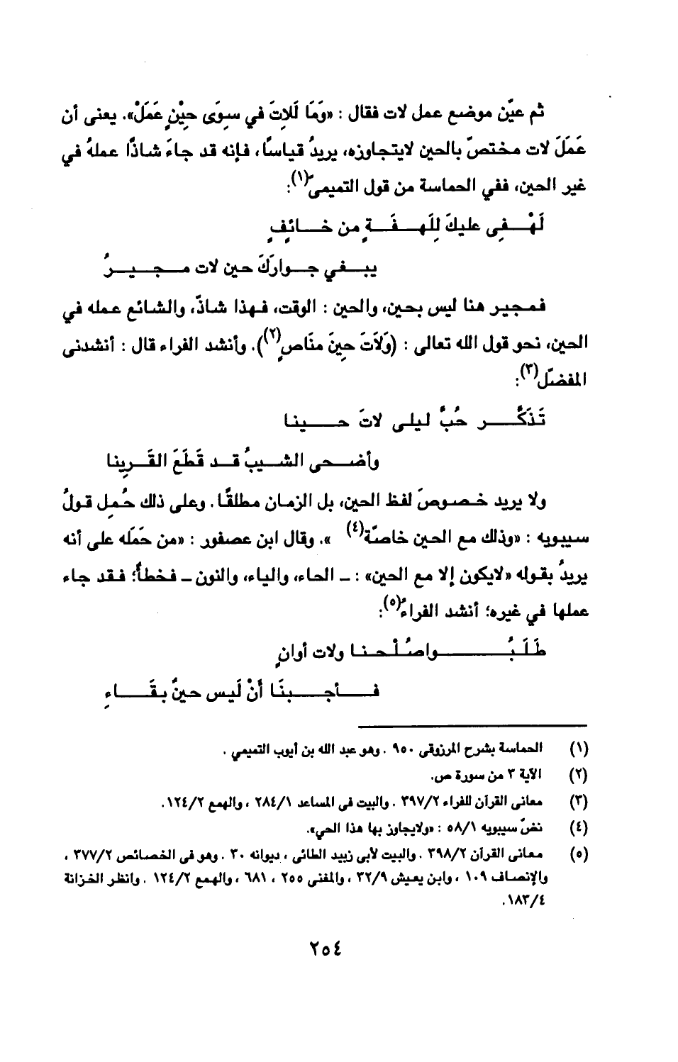 ولا يريد خصوصَ لفظ الحين، بل الزمان مطلقًا. وعلى ذلك حُمِل قولُ سيبويه: «وذلك مع الحين خاصّة». وقال ابن عصفور: «من حَمَله على أنه يريدُ بقوله «لا يكون إلا مع الحين»: -الحاء، والياء، والنون- فخطأ؛ فقد جاء عملها في غيره؛ أنشد الفراءُ: