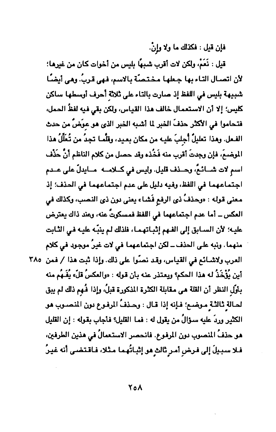 قيل: نَعَمْ، ولكن لات أقرب شبهًا بليس من أخوات كان من غيرها؛ لأن اتصال التاء بها جعلها مختصّة بالاسم، فهى قربُ. وهى أيضًا شبيهة بليس في اللفظ إذ صارت بالتاء على ثلاثةِ أحرف أوسطها ساكن كليس؛ إلا أن الاستعمال خالف هذا القياس، ولكن بقي فيه لفظُ الحمل، فتحاموا في الأكثر حذفَ الخبر لما أشبه الخبر الذى هو عِوَضٌ من حدث الفعل. وهذا تعليلٌ أُجلِبَ عليه من مكان بعيد، وقلّما تجدُ من تُعَلّلُ هذا الموضعَ، فإن وجدتَ أقرب منه فَخُذه وقد حصل من كلام الناظم أَنّ حَذْف اسمِ لات شائعٌ، وحذف قليل. وليس في كلامه ما يدلّ على عدم اجتماعهما في الفظ، وفيه دليل عى عدم اجتماعهما في الحذف؛ إذ معنى قوله: «وحذفُ ذى الرفعِ فَشا» يعنى دون ذى النصب، وكذلك في العكس -أما عدم اجتماعهما في اللفظ فمسكوتٌ عنه، وعند ذاك يعترض عليه؛ لأن السابق إلى الفهم إثباتهما، فلذلك لم ينبّه عليه في الثابت منهما. ونبه على الحذف- لكن اجتماعهما في لات غيرُ موجود في كلام العرب ولا شائع في القياس، وقد نصّوا على ذلك. وإذا ثبت هذا/ فمن أين يُؤْخَذُ له هذا الحكم؟ ويعتذر عنه بأن قوله: «والعكسُ قل» يُفهَمُ منه بأوّلِ النظر أن القلة هى مقابلة الكثرة المذكورة قبلُ، وإذا فُهِم ذلك لم يبق لحالةٍ ثالثةٍ موضع؛ فإنه إذا قال: وحذفُ المرفوع دون المنصوب هو الكثير وردَ عليه سؤالُ من يقول له: فما القليل؟ فأجاب بقوله: إن القليل هو حذفُ المنصوب دون المرفوع. فانحصر الاستعمالُ في هذين الطرفين، فلا سبيلَ إلى فرضِ أمرٍ ثالثٍ هو إثباتُهما مثلا، فاقتضى أَنه غيرُ