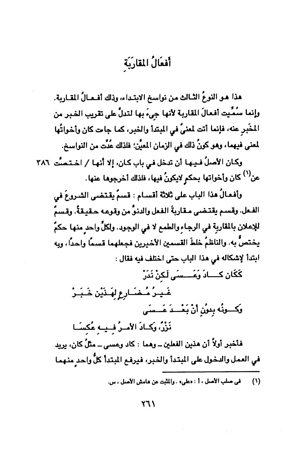 وأفعالُ هذا الباب على ثلاثة أقسام: قسمٌ يقتضى الشروعَ في الفعل. وقسم يقتضى مقاربةَ الفعل والدنوّ من وقوعه حقيقةً. وقسمٌ للإعلان بالمقاربِة في الرجاءِ والطمع لا في الوجود. ولكلِّ واحدٍ منها حكمٌ يختصُّ به. والناظمُ خلطَ القسمين الأخيرين فجعلهما قسمًا واحدًا، وبه ابتدأ لإشكله في هذا الباب حتى اختلف فيه فقال: