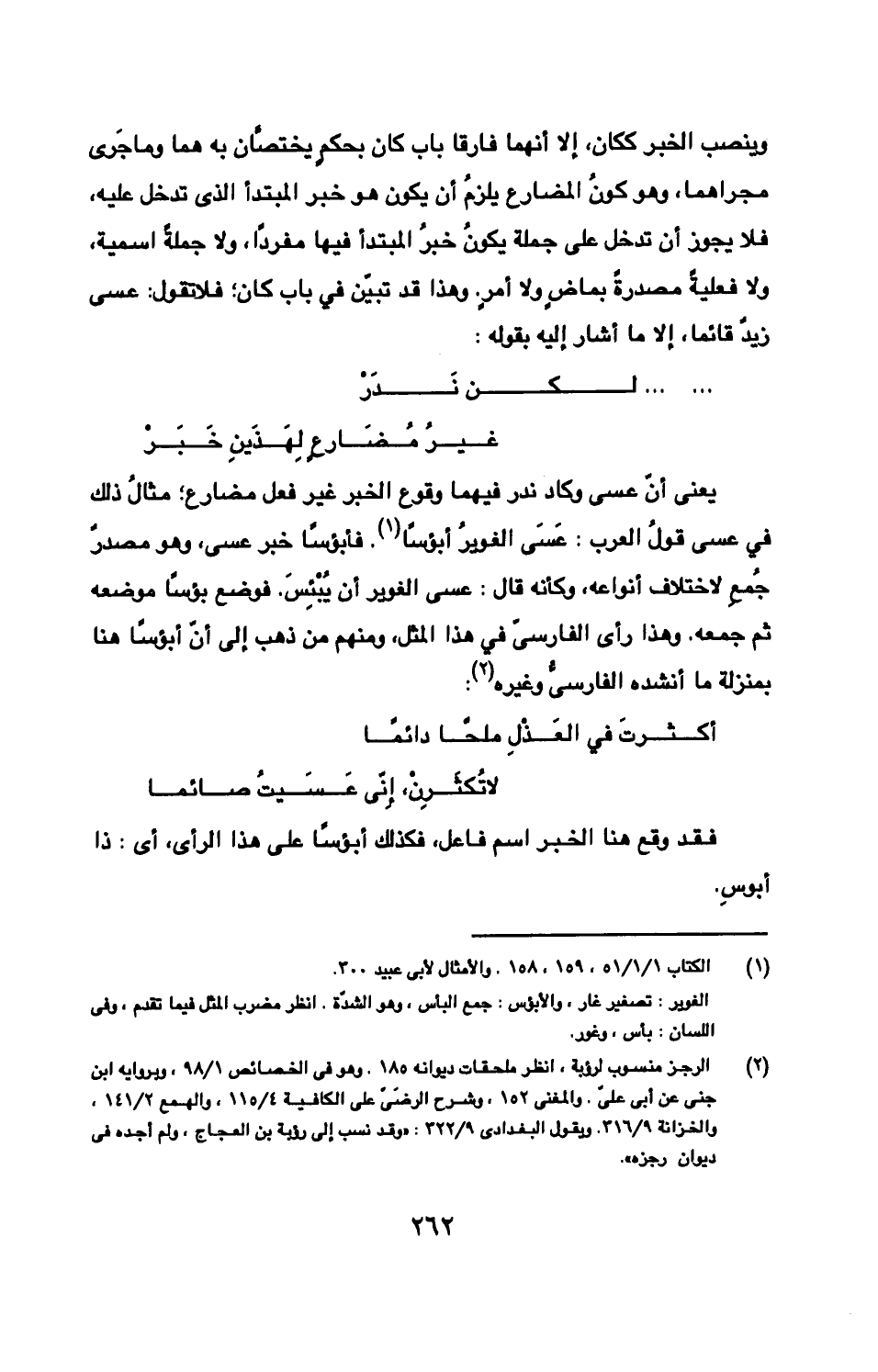 يعنى أنّ عسى وكاد ندر فيهما وقوع الخبر غير فعل مضارع؛ مثالُ ذلك في عسى قولُ العرب: عَسَى الغويرُ أبؤسًا. فأبؤسًا خبر عسى، وهو مصدرٌ جُمعِ لاختلاف أنواعه، وكأنه قال: عسى الغوير أن يُبْئِسَ. فوضع بؤسً موضعه ثم جمعه. وهذا رأى الفارسىّ في هذا المثل، ومنهم من ذهب إلى أنّ أبؤسًا هنا بمنزلة ما أنشده الفارسىُّ وغيره: