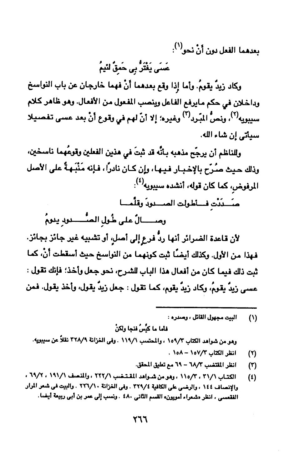 وكاد زيدٌ يقومُ. وأما إِذا وقع بعدهما أَنْ فهما خارجان عن باب النواسخ وداخلان في حكم ما يرفع الفاعل وينصب المفعول من الأفعال. وهو ظاهر كلام سيبويه، ونصُّ المبرد وغيره؛ إلا أنّ لهم في وقوع أنْ بعد عسى تفصيلا سيأتى إن شاء الله.