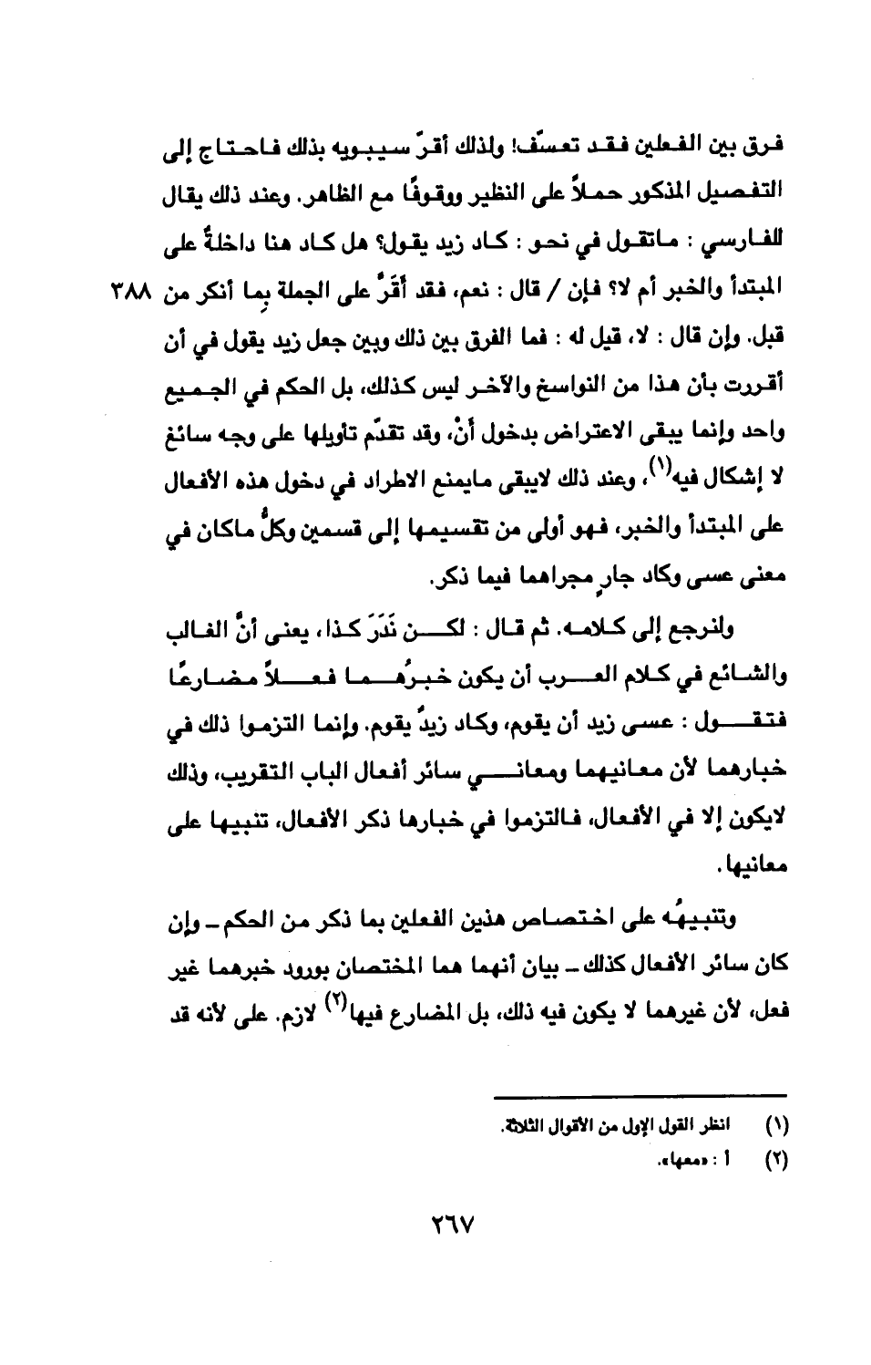 فرق بين الفعلين فقد تعسّف! ولذلك أقرّ سيبويه بذلك فاحتاج إلى التفصيل المذكور حملًا على النظير ووقوفًا مع الظاهر. وعند ذلك يقال للفارسي: ما تقول في نحو: كاد زيد يقول؟ هل كاد هنا داخلةٌ على المبتدأ والخبر أم لا؟ فإن/ قال: نعم، فقد أَقَرّ على الجملة بِما أنكر من قبل. وإن قال: لا، قيل له: فما الفرق بين ذلك وبين جعل زيد يقول في أن أقررت بأن هذا من النواسخ والآخر ليس كذلك، بل الحكم في الجميع واحد وإنما يبقى الاعتراض بدخول أَنْ، وقد تقدّم تأويلها على وجه سائغ لا إشكال فيه، وعند ذلك لا يبقى ما يمنع الاطراد في دخول هذه الأفعال على المبتدأ والخبر، فهو أولى من تقسيمها إلى قسمين وكلّ ما كان في معنى عسى وكاد جارٍ مجراهما فيما ذكر.