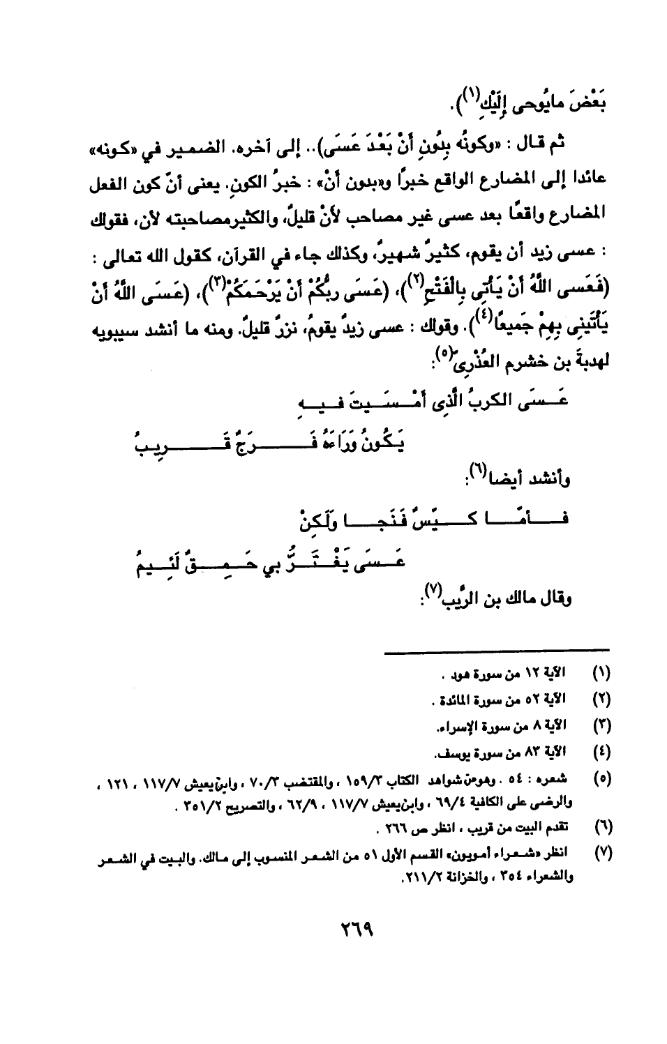 ثم قال: «وكونُه بِدُونِ أَنْ بَعْدَ عَسَى» .. إلى آخره. الضمير في «كونه» عائدا إلى المضارع الواقع خبرًا «وبدون أَنْ»: خبرُ الكونِ. يعنى أنّ كون الفعل المضارع واقعًا بعد عسى غير مصاحب لأَنْ قليلٌ، والكثير مصاحبته لأن، فقولك: عسى زيد أن يقوم، كثيرٌ شهيرٌ، وكذلك جاء في القرآن، كقول الله تعالى: {فَعَسى اللهُ أَنْ يَأْتِي بِالْفَتْحِ}، {عَسَى ربُّكُمْ أَنْ يَرْحَمَكُمْ}، {عَسَى اللهُ أَنْ يَأْتَينِي بِهِمْ جَميعًا}. وقولك: عسى زيدٌ يقومُ، نزرٌ قليلٌ. ومنه ما أنشد سيبويه لهدبةَ بن خشرم العُذْرِىّ: