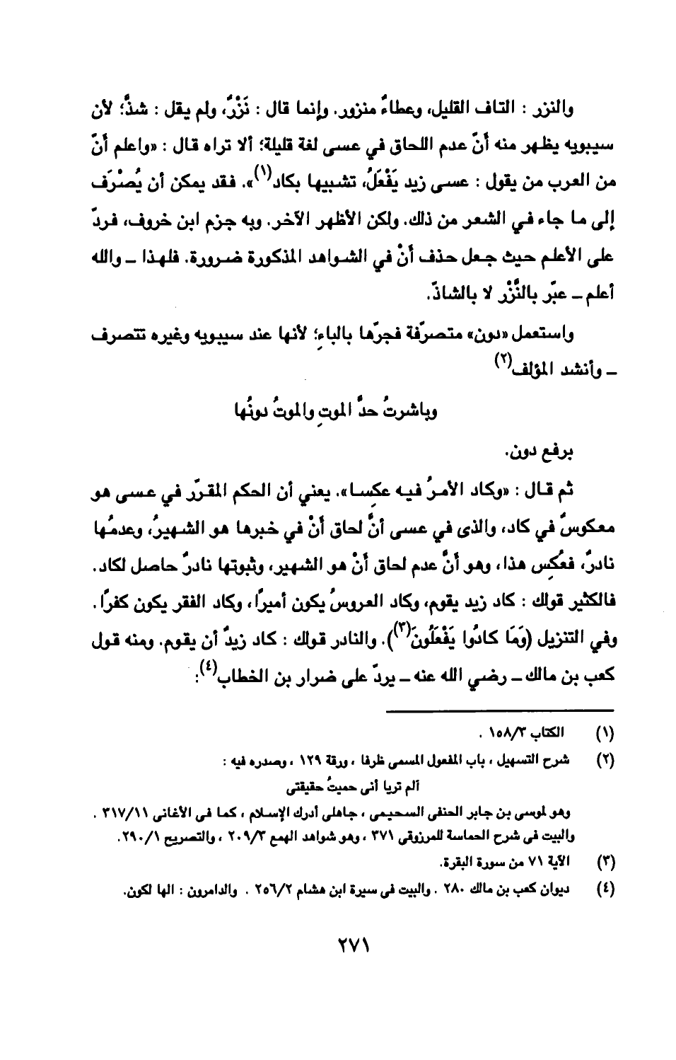 والنزر: التاف القليل، وعطاءٌ منزور. وإنما قال: نَزْرٌ، ولم يقل: شذّ؛ لأن سيبويه يظهر منه أَنّ عدم اللحاق في عسى لغة قليلة؛ ألا تراه قال: «واعلم أَنّ من العرب من يقول: عسى زيد يَفْعَلُ، تشبيها بكاد». فقد يمكن أن يُصْرَف إلى ما جاء في الشعر من ذلك. ولكن الأظهر الآخر. وبه جزم ابن خروف، فردّ على الأعلم حيث جعل حذف أَنْ في الشواهد المذكورة ضرورة. فلهذا -والله أعلم- عبّر بالنّزْر لا بالشاذّ.