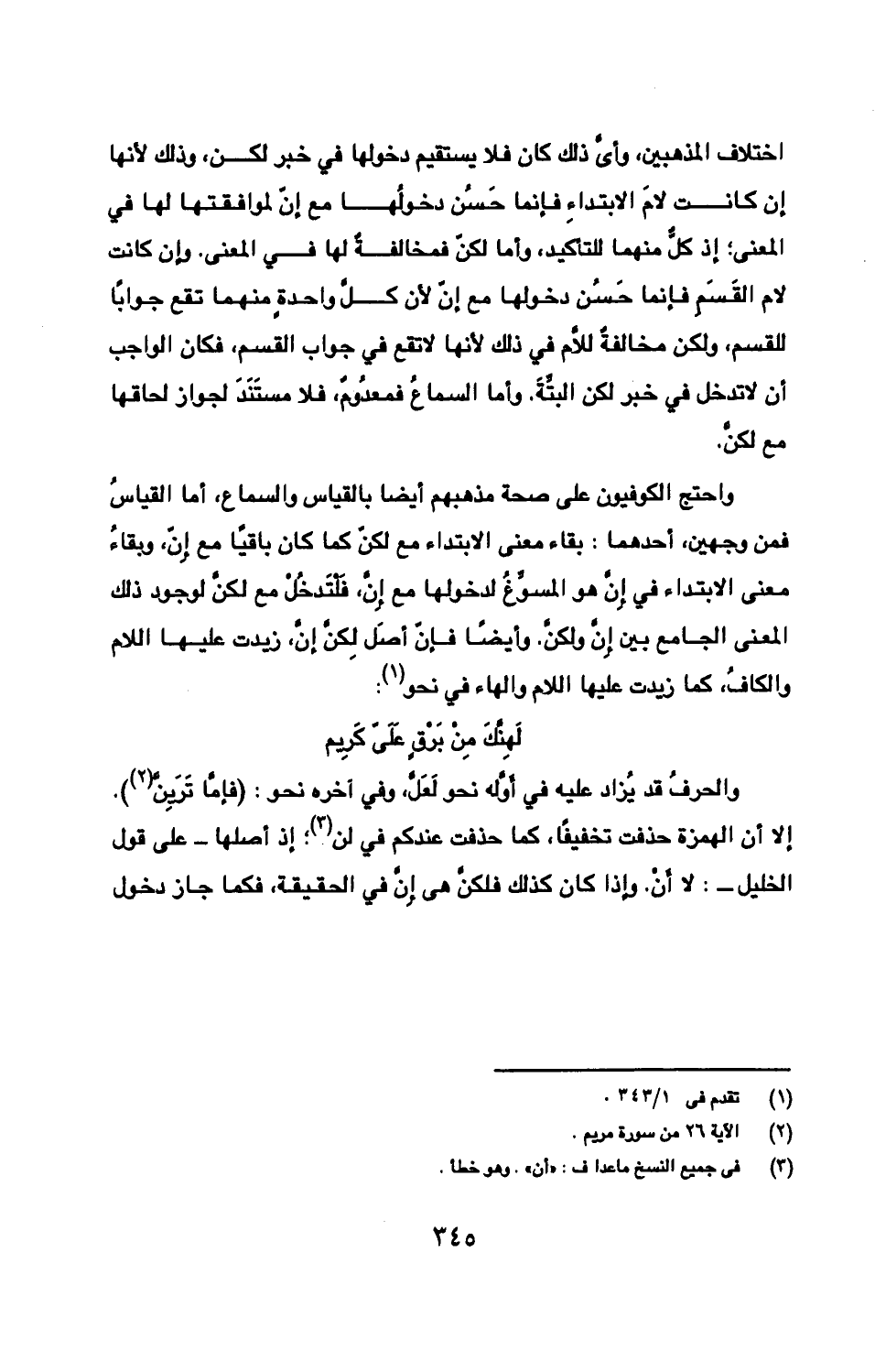 اختلاف المذهبين، وأىّ ذلك كان فلا يستقيم دخولها في خبر لكن، وذلك لأنها إن كانت لامَ الابتداءِ فإنما حَسُن دخولُها مع إنّ لموافقتها لها في المعنى؛ إذ كلٌّ منهما للتأكيد، وأما لكنّ فمخالفةٌ لها في المعنى. وإن كانت لام القَسَمِ فإنما حَسُن دخولها مع إنّ لأن كلّ واحدةٍ منهما تقع جوابًا للقسم، ولكن مخالفةٌ للّام في ذلك لأنها لا تقع في جواب القسم، فكان الواجب أن لا تدخل في خبر لكن البتّةَ. وأما السماعُ فمعدُومٌ، فلا مستَنَدَ لجواز لحاقها مع لكنّ.
