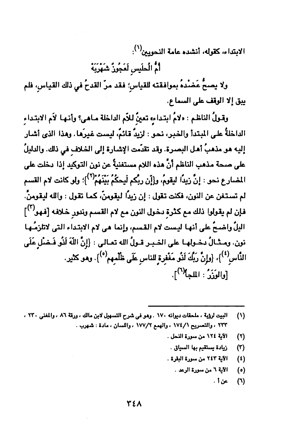 وقولُ الناظم: «لامُ ابتداءٍ» تعينٌ للّام الداخلة ما هى؟ وأنها لَام الابتداءِ الداخلةُ على المبتدأ والخبر، نحو: لزيدٌ قائمٌ، ليست غيرَها. وهذا الذى أشار إليه هو مذهبُ أهل البصرة. وقد تقدّمت الإشارة إلى الخلافِ في ذلك. والدليلُ على صحة مذهب الناظم أَنّ هذه اللام مستغنيةٌ عن نون التوكيد إذا دخلت على المضارع نحو: إِنّ زيدًا ليقومُ، و {إن ربّكم لَيحكُمُ بَيْنَهُم}؛ ولو كانت لام القسم لم تستغن عن النون، فكنت تقول: إن زيدًا ليقومنّ، كما تقول: والله ليقومنّ. فإن لم يقولوا ذلك مع كثرةِ دخول النون مع لام القسم وندورِ خلافه [فهو] اليلٌ واضحٌ على أنها ليست لام القسم، وإنما هى لام الابتداء التى لا تلزمُها نون. ومثالُ دخولها على الخبر قولُ الله تعالى: {إِنّ اللهَ لَذُو فَضْلٍ عَلَى النّاسِ}، {وإِنّ رَبّكَ لَذُو مَغْفِرةٍ للناسِ عَلَى ظُلْمِهم}. وهو كثير.