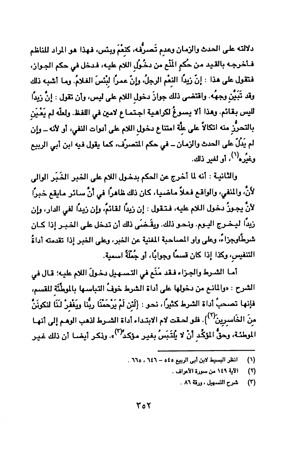دلالته على الحدث والزمان وعدمِ تَصرُّفه، كنِعْمَ وبئس، فهذا هو المراد للناظم فأخرجه بالقيد من حُكمِ المَنْع من دُخُولِ اللام عليه، فدخل في حكم الجواز، فتقول على هذا: إنّ زيدًا النِعْم الرجلُ، وإنّ عمرًا لِبِئْسَ الغلامُ. وما أشبه ذلك وقد تَبَيَّنِ وجهُه. واقتضى ذلك جوازَ دخولِ اللام على ليس، وأن تقول: إنّ زيدًا لليس بقائم. وهذا ألا يسوغُ لكراهية اجتماع لامين في اللفظ. ولعلّه لم يَعْيَنِ بالتحرُّزِ منه اتكالًا على عِلّة امتناع دخولِ اللام على أدوات النفي، أو لأنه -وإن لم يَدُلّ على الحدث والزمان- في حكم المتصرّف، كما يقول فيه ابن أبي الربيع وغيرُه، أو لغير ذلك.