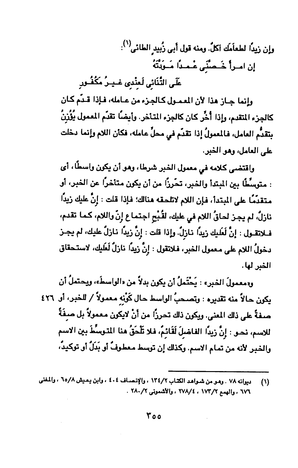 واقتضى كلامه في معمول الخبر شرطا، وهو أن يكون واسطًا، أى: متوسِّطًا بين المبتدأ والخبر، تحرزًا من أن يكون متأخرًا عن الخبر، أو متقدّمًا على المبتدأ، فإن اللام لا تلحقه هنالك؛ فإذا قلت: إِنّ عليك زيدًا نازلٌ، لم يجز لحاقُ اللام في عليك، لقُبْحِ اجتماع إِنّ واللام، كما تقدم، فلا تقول: إنّ لَعَليك زيدًا نازِلٌ. وإذا قلت: إِنّ زيدًا نازلٌ عليك، لم يجز دخولُ اللام على معمول الخبر، فلا تقول: إِنّ زيدًا نازلٌ لَعَليك، لاستحقاق الخبر لها.