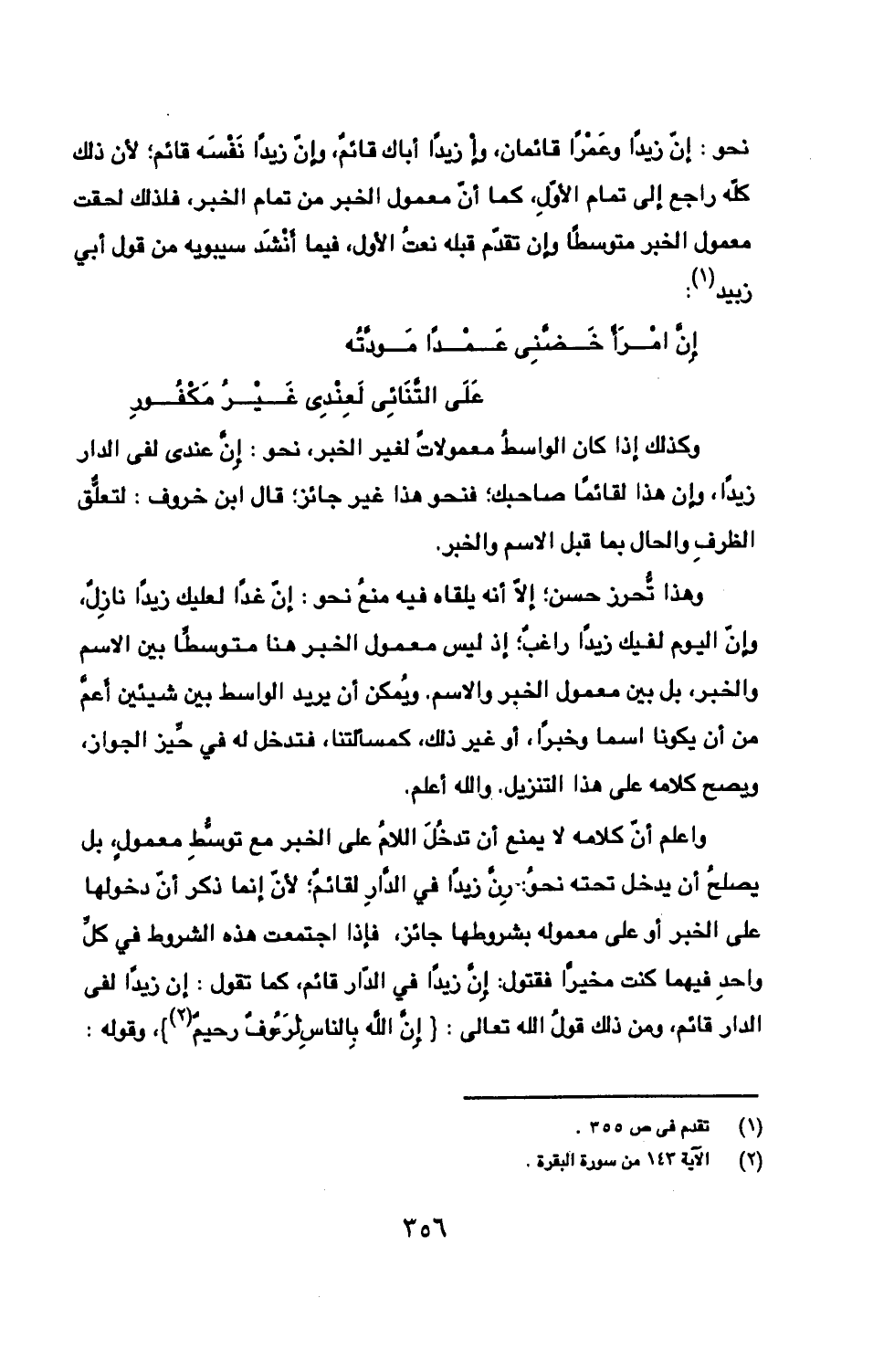 واعلم أنّ كلامه لا يمنع أن تدخُلَ اللامُ على الخبر مع توسُّطِ معمولٍ، بل يصلحُ أن يدخل تحته نحوُ: رِنّ زيدًا في الدار لقائمٌ؛ لأن إنما ذكر أنّ دخولها على الخبر أو على معموله بشروطها جائز، فإذا اجتمعت هذه الشروط في كلِّ واحد فيهما كنت مخيرا فقتول: إِنّ زيدًا في الدّار قائم، كما تقول: إن زيدًا لفى الدار قائم، ومن ذلك قولُ الله تعالى: {إِنّ الله بِالنّاسِ لرَءُوفٌ رحيمٌ}، وقوله: