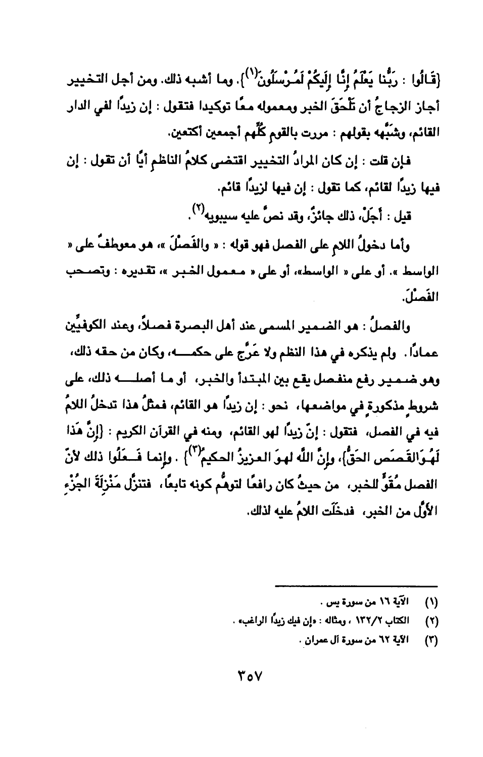 {قَالُوا: رَبُّنا يَعْلَمُ إِنّا إِلَيكُمْ لَمُرْسَلُونَ}. وما أشبه ذلك. ومن أجل التخيير أجاز الزجاجُ أن تَلْحَقَ الخبر ومعموله معًا توكيد فتقول: إن زيدًا لفي الدار القائم، وشَبَّهه بقولهم: مررت بالقومِ كُلُّم أجمعين أكتعين.