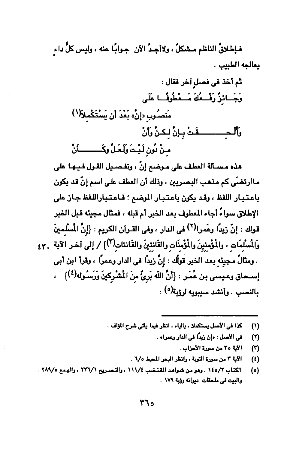هذه مسالة العطف على موضع إنّ، وتفصيل القول فيها على ما ارتضَى كم مذهب البصريين، وذلك أن العطف على اسم إنّ قد يكون باعتبار اللفظ، وقد يكون باعتبار الموضع؛ فاعتبار اللفظ جاز على الإطلاق سواءً أجاء المعطوف بعد الخبر أم قبله، فمثال مجيئه قبل الخبر قولك: إنّ زيدًا وعَمرا فى الدار، وفى القرآن الكريم: {إِنّ المُسْلِمينَ وَالمُسْلِمَاتِ، والمُؤْمِنِيِنَ والمُؤْمِنَاتِ والقَانِتِينَ والقَانتاتِ} / إلى آخر الآية. ومثالُ مجيئِهِ بعد الخبر قولُك: إِنّ زيدًا فى الدار وعمرًا، وقرأ ابن أبى إسحاق وعيسى بن عُمَر: {أَنّ الله بَرِئٌ مِنَ المُشْرِكينَ وَرَسُوله}، بالنصب. وأنشد سيبويه لرؤبة: