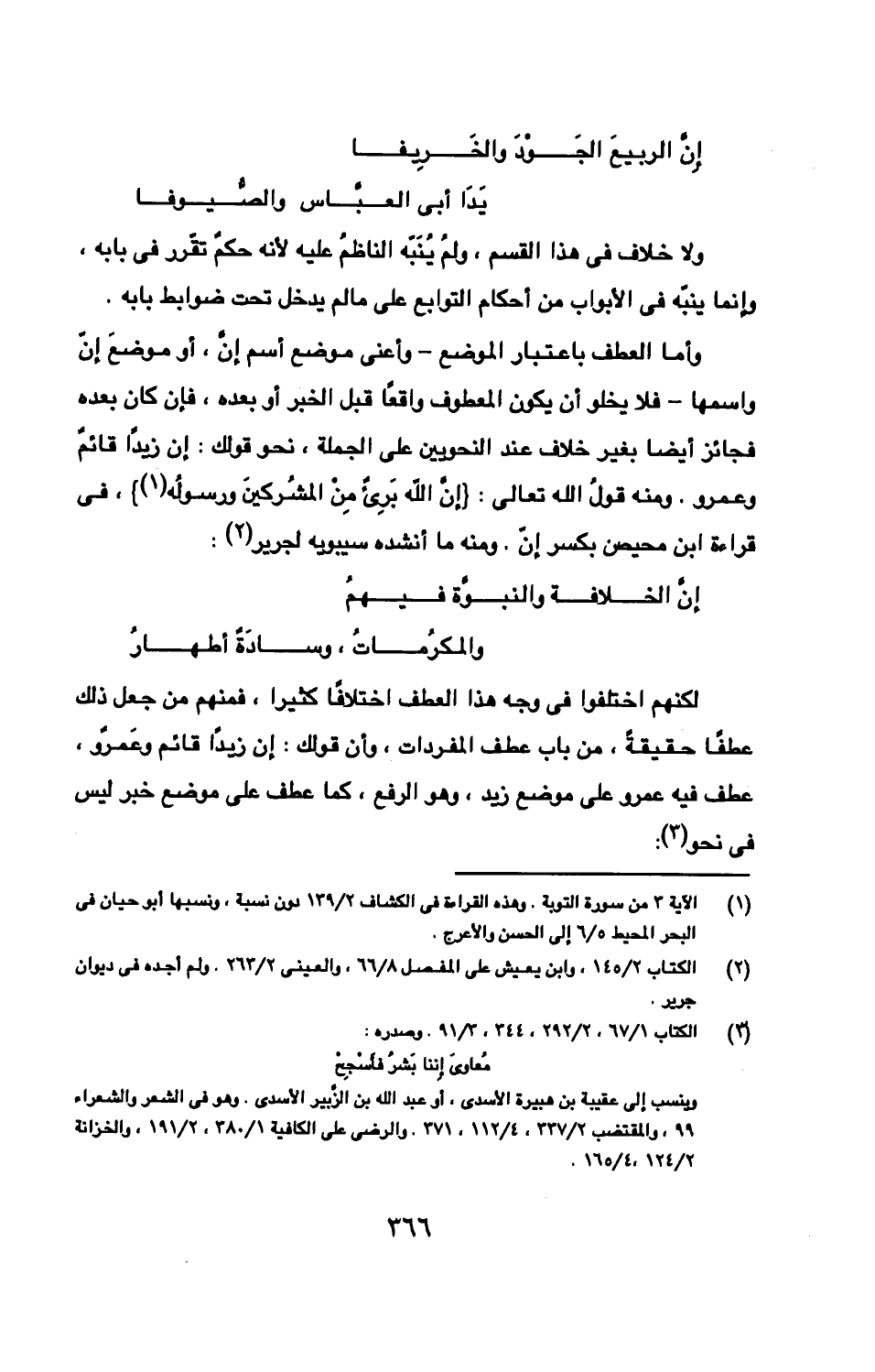 وأما العطف باعتبار الموضع -وأعنى موضع أسم إنّ، أو موضعَ إنّ واسمها- فلا يخلو أن يكون المعطوف واقعًا قبل الخبر أو بعده، فإن كان بعده فجائز أيضا بغير خلاف عند النحويين على الجملة، نحو قولك: إن زيدًا قائمٌ وعمرو. ومنه قولُ الله تعالى: {إنّ الله بَرِئٌ مِنَ المشركينَ ورسولُه}، فى قراءة ابن محيصن بكسر إنّ. ومنه ما أنشده سيبويه لجرير: