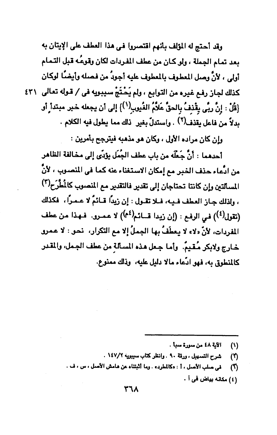 وقد أحتج له المؤلف بأنهم اقتصروا فى هذا العطف على الإيتان به بعد تمام الجملة، ولو كان من عطف المفردات لكان وقوعُه قبل التمام أولى، لأنّ وصل المعطوف بالمعطوف عليه أجودُ من فصله وأيضًا لو كان كذلك لجاز رفع غيره من التوابع، ولم يَحْتَجْ سيبويه في/ قوله تعالى: {قُلْ: إِنّ ربّي يقْذِفُ بِالحقِّ عَلَّامُ الغُيوبِ} إلى أن يجعله خبر مبتدأٍ أو بدلًا من فاعل يقذف. واستدلّ بغير ذلك مما يطول فيه الكلام.