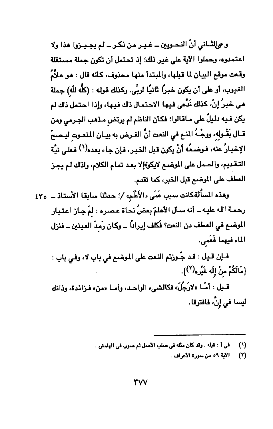وهذه المسألة كانت سبب عَمَى «الأَعْلَمِ» /؛ حدثنا سابقا الأستاذ -رحمة الله عليه- أنه سأل الأعلمَ بعضُ نحاة عصره: لِمَ جاز اعتبار الموضع في العطف دن النعت؟ فَكلف إيرادًا -وكان رَمِدَ العينين- فنزل الماء فيهما فَعَمِى.