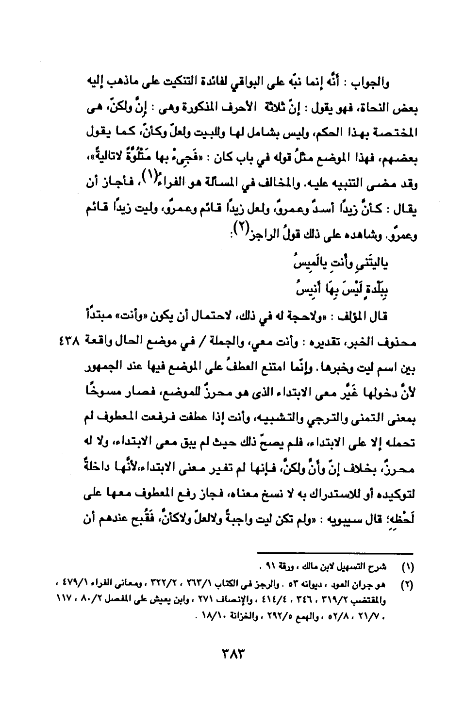 والجواب: أنّه إنما نبّه على البواقي لفائدة التنكيت على ما ذهب إليه بعض النحاة، فهو يقول: إنّ ثلاثة الأحرف المذكورة وهى: إِنّ ولكنّ، هى المختصة بهذا الحكم، وليس بشامل لها وللبيت ولعلّ وكأنّ، كما يقول بعضهم، فهذا الموضع مثلُ قوله في باب كان: «فَجِئْ بها مَتْلُوّةً لا تاليةٌ»، وقد مضى التنبيه عليه. والمخالف في المسألة هو الفراءُ، فأجاز أن يقال: كأنّ زيدًا أسدٌ وعمروٌ، ولعل زيدًا قائم وعمروٌ، وليت زيدًا قائم وعمروٌ. وشاهده على ذلك قولُ الراجز: