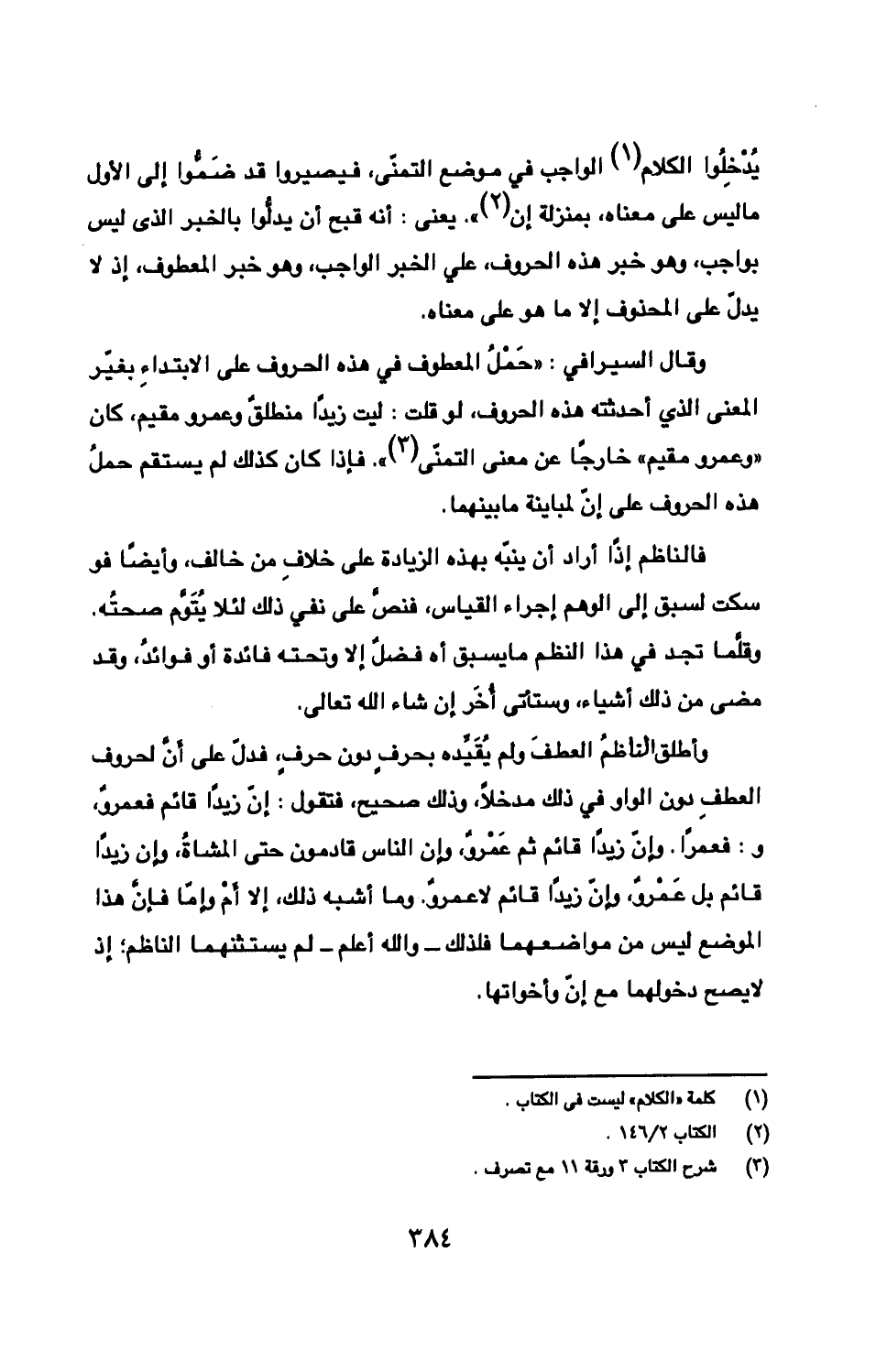 يُدْخِلُوا الكلام الواجب في موضع التمنّى، فيصيروا قد ضَمُّوا إلى الأول ما ليس على معناه، بمنزلة إن». يعنى: أنه قبح أن يدلُّوا بالخبر الذى ليس بواجب، وهو خبر هذه الحروف، علي الخبر الواجب، وهو خبر المعطوف، إذ لا يدلّ على المحذوف إلا ما هو على معناه.