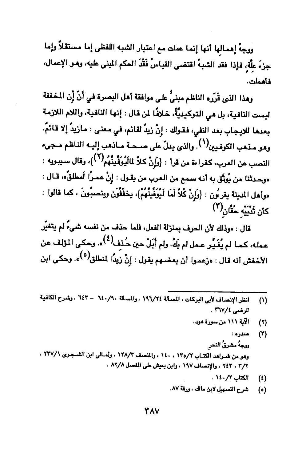 قال: «وذلك لأن الحرف بمنزلة الفعل، فلما حذف من نفسه شئٌ لم يتغيّر عمله، كما لم يُغَيِّر عمل لم يَكُ. ولم أُبَلْ حين حُذِف». وحكى المؤلف عن الأخفش أنه قال: «زعموا أن بعضهم يقول: إِنْ زيدًا لمنطلق». وحكى ابن