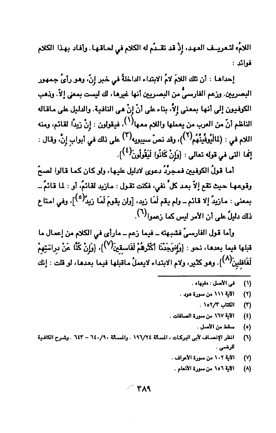 إحداها: أن تلك اللامَ لامُ الابتداء الداخلةُ في خبر إِنّ، وهو رأىُ جمهور البصريين. وزعم الفارسىُّ من البصريين أنها غيرها، لك ليست بمعنى إلّا. وذهب الكوفيون إلى أنها بمعنى إِلّا، بناء على أنّ إِنْ هى النافية. والدليل على ما قاله الناظم أنّ من العرب من يعملها واللام معها، فيقولون: إِنْ زيدًا لقائم، ومنه اللام في: {لما لَيُوفِّينّهُم}، وقد نصّ سيبويه على ذلك في أبوابِ إِنّ، وقال: إنها التى في قوله تعالى: {وَإِنْ كَانُوا لَيَقُولُونَ}.