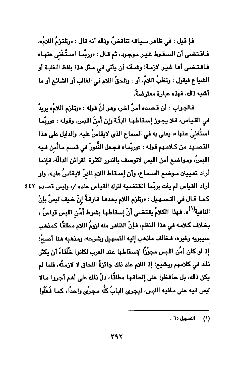 فالجواب: أن قصده أمرٌ آخر، وهو أنّ قوله: «وتلزم اللامُ» يريدُ في القياس، فلا يجوز إسقاطها البتّة وإن أُمِنَ اللبس. وقوله: «وربّما استُغنِىَ عنها»، يعنى به في السماع الذى لا يقاسُ عليه. والدليل على هذا القصيد من كلامهم قوله: «وربّما» فجعل النُّدورَ في قسم ما أُمِن فيه اللبسُ، ومواضع أمن اللبس لا توصف بالندور لكثرة القراءة الدالّة، فإنما أراد تعيينن موضع السماع، وأن إسقاط اللام نادِرٌ لا يقاسُ عليه. ولو أراد القياس لم يأت بربّما المقتضية لترك القياس عنده/، وليس قصده كما قال في التسهيل: «وتلزم اللام بعدها فارقةً إِنْ خيف لبسٌ بإنْ النافية». فهذا الكلامُ يقتضى أَنّ إسقاطها بشرط أَمْنِ اللبس قياسٌ، بخلاف كلامه في هذا النظم، فإنّ الظاهر منه لزومُ اللام مطلقًا كمذهب سيبويه وغيره، فخالف ما ذهب إليه التسهيل وشرحه، ومذهبه هنا أصحّ؛ إذ لو كان أمُن اللبس مجوّزًا لإسقاطها عند العرب لكانوا خُلَقاءَ أن يكثر ذلك في كلامهم ويشيع؛ إذ اللام عند ذلك جائزةُ اللحاق لا لازمتُه، فلما لم يكن ذلك، بل حافظوا على إلحاقها مطلقًا، دلّ ذلك على أهم أجروا ما لا لبس فيه على ما فيه اللبس، ليجرى البابُ كلُّه مجرًى واحدًا، كما فَعَلُوا