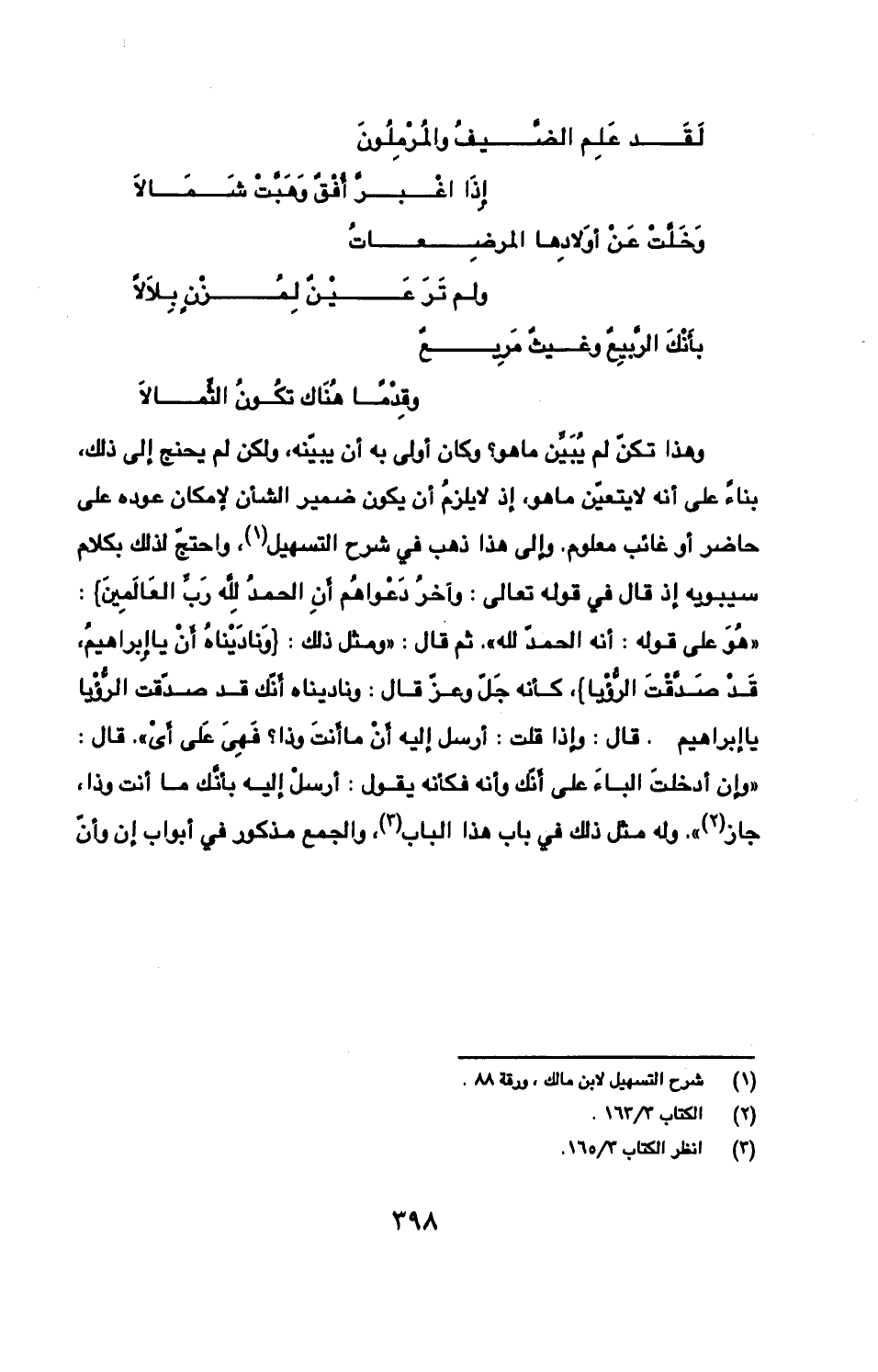 وهذا تكنّ لم يُبَيّن ما هو؟ وكان أولى به أن يبيّنه، ولكن لم يحنج إلى ذلك، بناءً على أنه لا يتعيّن ما هو، إذ لا يلزمُ أن يكون ضمير الشأن لإمكان عوده على حاضر أو غائب معلوم. وإلى هذا ذهب في شرح التسهيل، واحتجّ لذلك بكلام سيبويه إذ قال في قوله تعالى: {وآخرُ دَعْوَاهُم أَنِ الحمدُ لِله رَبِّ العَالَمِينَ}: «هوَ على قوله: أنه الحمد لله». ثم قال: «ومثل ذلك: {وَنادَيْناهُ أَنْ يا إِبراهيمُ، قَدْ صَدّقْتَ الرُّؤْيا}، كأنه جَلّ وعزّ قال: وناديناه أَنّك قد صدّقت الرُّؤْيا يا إبراهيم. قال: وإذا قلت: أرسل إليه أَنْ ما أنتَ وذا؟ فَهِىَ عَلى أَىْ». قال: «وإن أدخلتَ الباءَ على أَنّك وأنه فكأنه يقول: أرسلْ إليه بأنّك ما أنت وذا جاز». وله مثل ذلك في باب هذا الباب، والجمع مذكور في أبواب إن وأنّ