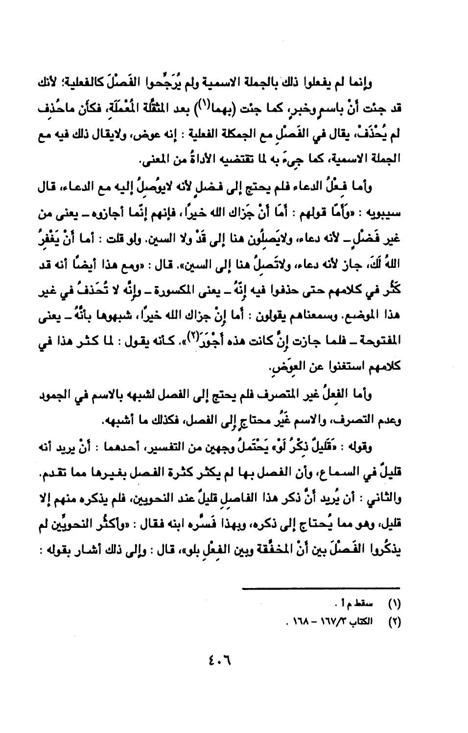وأما الفِعلُ غير المتصرف فلم يحتج إلى الفصل لشبهه بالاسم في الجمود وعدم التصرف، والاسم غَيرُ محتاجٍ إِلى الفصل، فكذلك ما أشبهه.