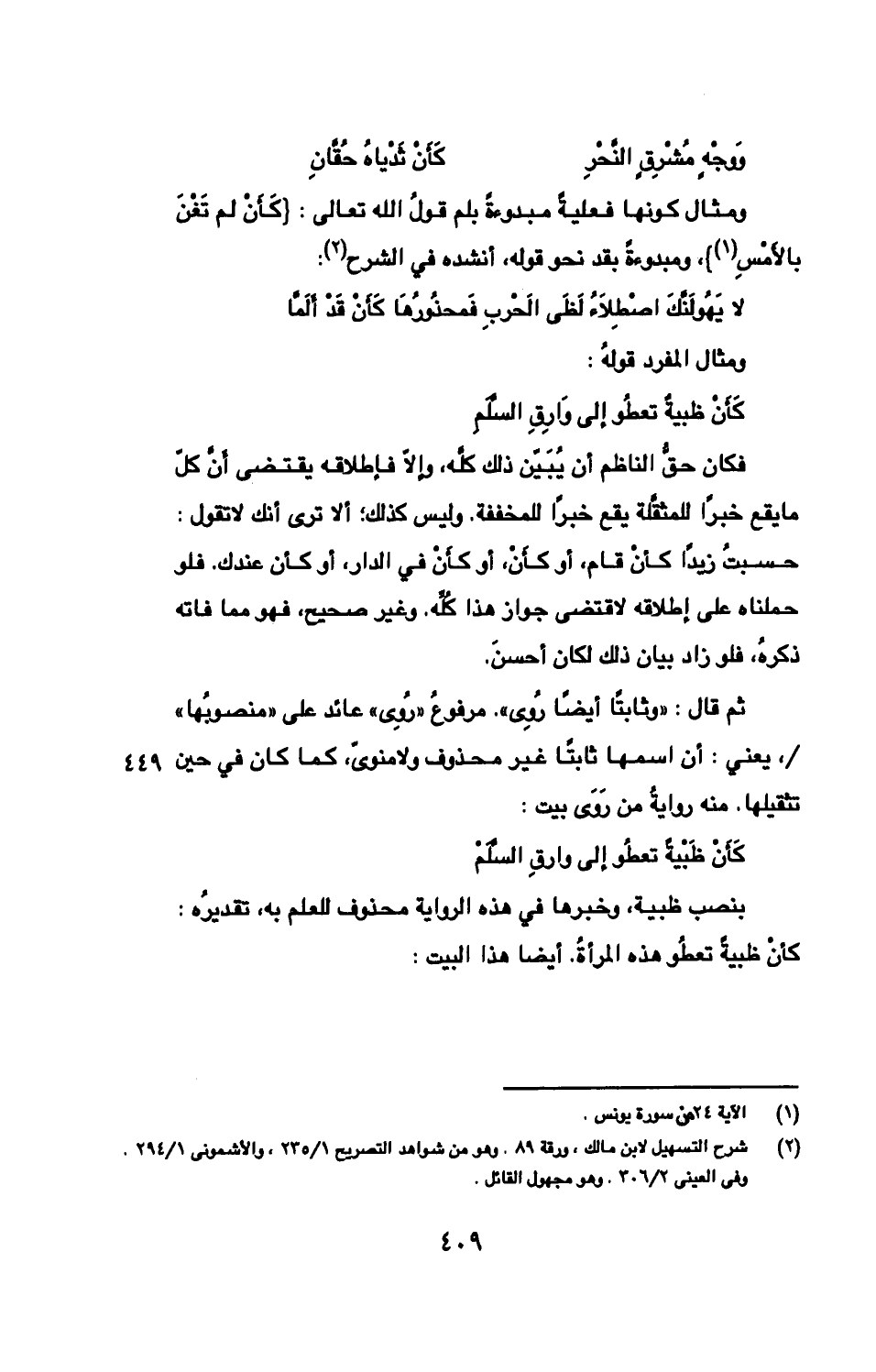 ومثال كونها فعليةً مبدوءةً بلم قولُ الله تعالى: {كَأَنْ لم تَغْنَ بالأَمْسِ}، ومبدوءةً بقد نحو قوله، أنشده في الشرح: